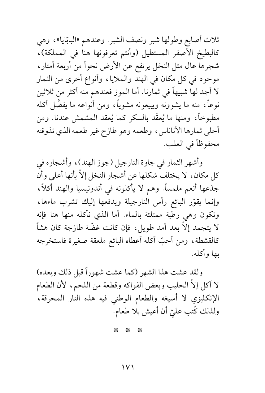 ثلاث أصابع وطولها شبر ونصف الشبر. وعندهم «البابّايا»، وهي كالبطيخ الأصفر المستطيل (وأنتم تعرفونها هنا في المملكة)، شجرها عال مثل النخل يرتفع عن الأرض نحواً من أربعة أمتار، موجود في كل مكان في الهند والملايا، وأنواع أخرى من الثمار لا أجد لها شبيهاً في ثمارنا. أما الموز فعندهم منه أكثر من ثلاثين نوعاً، منه ما يشوونه ويبيعونه مشوياً، ومن أنواعه ما يفضَّل أكله مطبوخاً، ومنها ما يُعقَد بالسكر كما يُعقد المشمش عندنا. ومن أحلى ثمارها الأناناس، وطعمه وهو طازج غير طعمه الذي تذوقته محفوظاً في العلب.