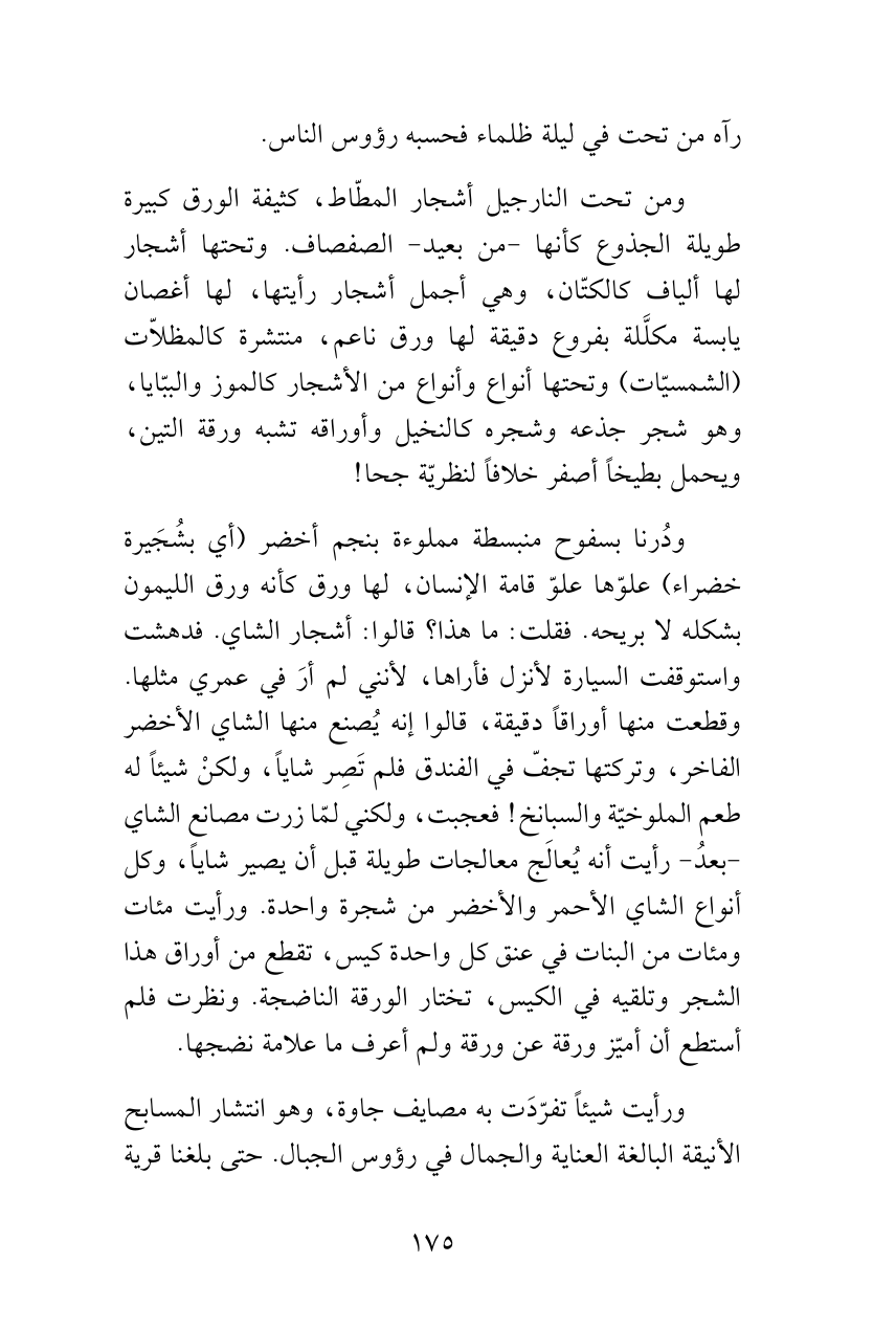 ودُرنا بسفوح منبسطة مملوءة بنجم أخضر (أي بشُجَيرة خضراء) علوّها علوّ قامة الإنسان، لها ورق كأنه ورق الليمون بشكله لا بريحه. فقلت: ما هذا؟ قالوا: أشجار الشاي. فدهشت واستوقفت السيارة لأنزل فأراها، لأنني لم أرَ في عمري مثلها. وقطعت منها أوراقاً دقيقة، قالوا إنه يُصنع منها الشاي الأخضر الفاخر، وتركتها تجفّ في الفندق فلم تَصِر شاياً، ولكنْ شيئاً له طعم الملوخيّة والسبانخ! فعجبت، ولكني لمّا زرت مصانع الشاي -بعدُ- رأيت أنه يُعالَج معالجات طويلة قبل أن يصير شاياً، وكل أنواع الشاي الأحمر والأخضر من شجرة واحدة. ورأيت مئات ومئات من البنات في عنق كل واحدة كيس، تقطع من أوراق هذا الشجر وتلقيه في الكيس، تختار الورقة الناضجة. ونظرت فلم أستطع أن أميّز ورقة عن ورقة ولم أعرف ما علامة نضجها.