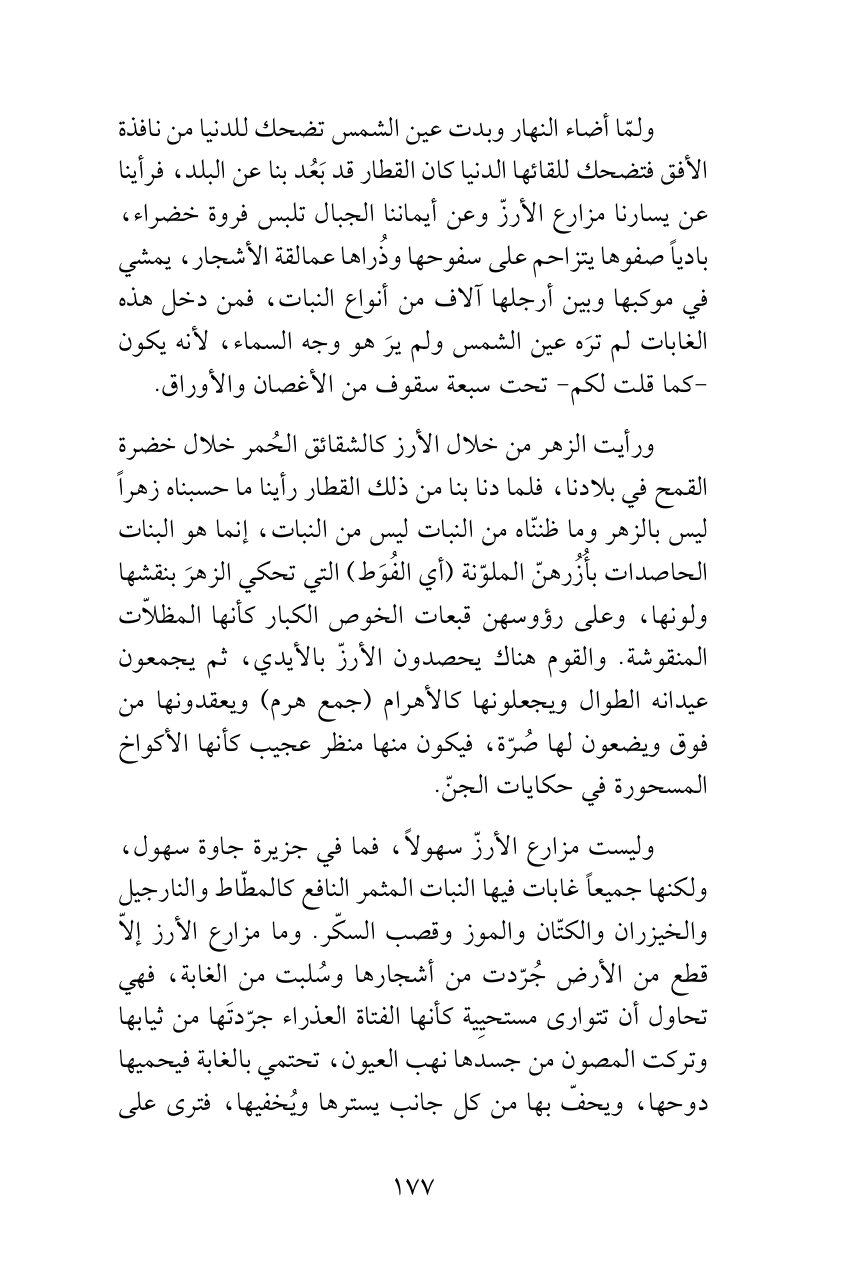 ورأيت الزهر من خلال الأرز كالشقائق الحُمر خلال خضرة القمح في بلادنا، فلما دنا بنا من ذلك القطار رأينا ما حسبناه زهراً ليس بالزهر وما ظننّاه من النبات ليس من النبات، إنما هو البنات الحاصدات بأُزُرهنّ الملوّنة (أي الفُوَط) التي تحكي الزهرَ بنقشها ولونها، وعلى رؤوسهن قبعات الخوص الكبار كأنها المظلاّت المنقوشة. والقوم هناك يحصدون الأرزّ بالأيدي، ثم يجمعون عيدانه الطوال ويجعلونها كالأهرام (جمع هرم) ويعقدونها من فوق ويضعون لها صُرّة، فيكون منها منظر عجيب كأنها الأكواخ المسحورة في حكايات الجنّ.
