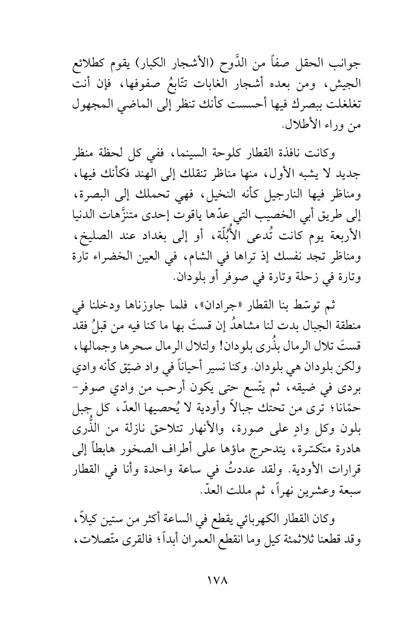 وكانت نافذة القطار كلوحة السينما، ففي كل لحظة منظر جديد لا يشبه الأول، منها مناظر تنقلك إلى الهند فكأنك فيها، ومناظر فيها النارجيل كأنه النخيل، فهي تحملك إلى البصرة، إلى طريق أبي الخصيب التي عدّها ياقوت إحدى متنزَّهات الدنيا الأربعة يوم كانت تُدعى الأُبُلّة، أو إلى بغداد عند الصليخ، ومناظر تجد نفسك إذ تراها في الشام، في العين الخضراء تارة وتارة في زحلة وتارة في صوفر أو بلودان.