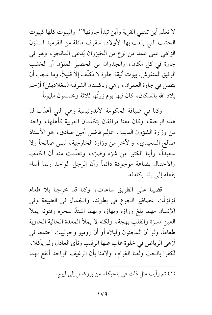 لا تعلم أين تنتهي القرية وأين تبدأ جارتها (¬1). والبيوت كلها كبيوت الخشب التي يلعب بها الأولاد: سقوف مائلة من القرميد الملوّن الزاهي على عمد من نوع من الخيزران يُدعى المانجو، وهو في جاوة في كل مكان، والجدران من الحصير الملوّن أو الخشب الرقيق المنقوش. بيوت أنيقة حلوة لا تكلّف إلاّ قليلاً. وما عجب أن يتصل في جاوة العمران، وهي وباكستان الشرقية (بنغلاديش) أزحم بلاد الله بالسكان، كان فيها يوم زرتُها ثلاثة وخمسون مليوناً.