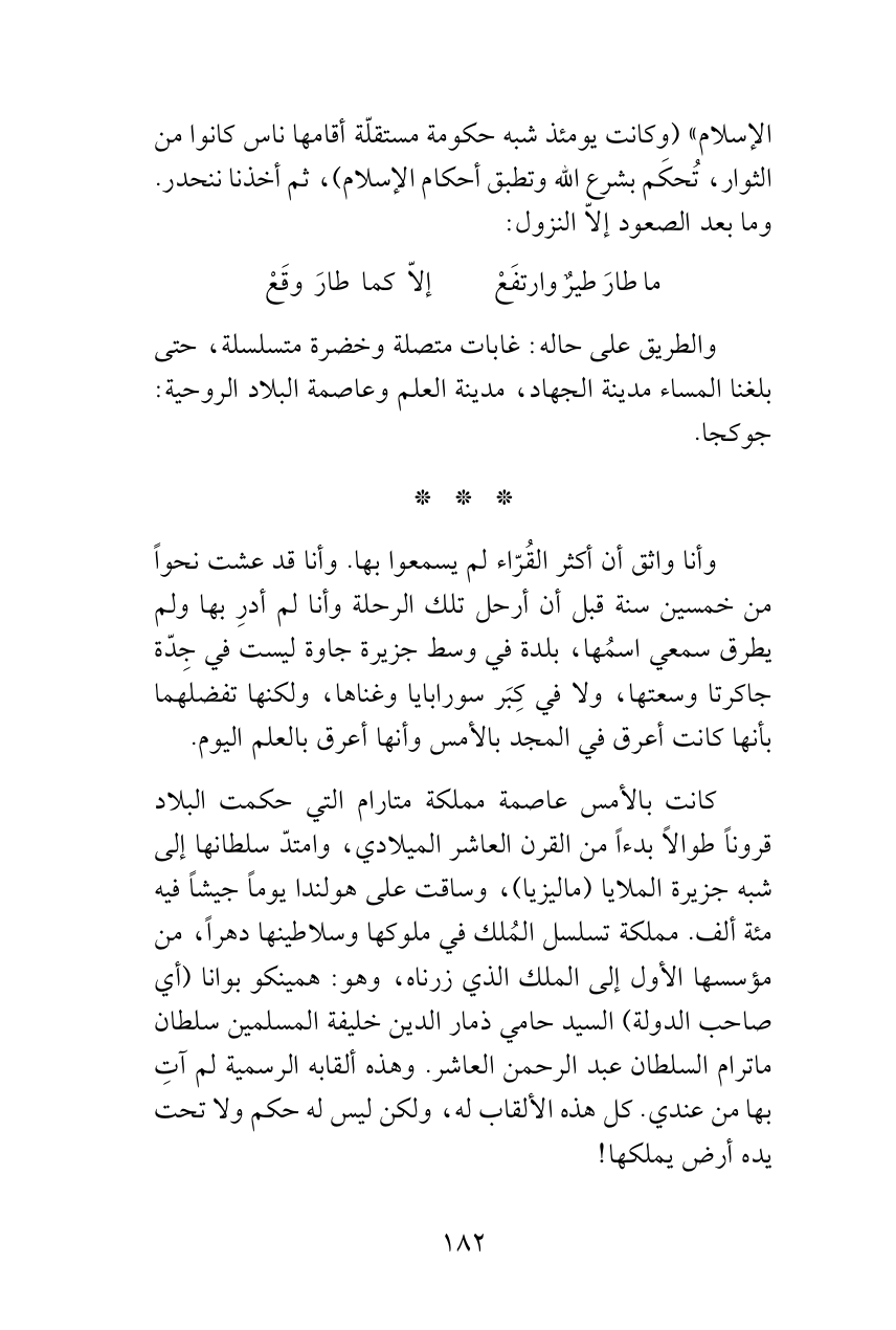 والطريق على حاله: غابات متصلة وخضرة متسلسلة، حتى بلغنا المساء مدينة الجهاد، مدينة العلم وعاصمة البلاد الروحية: جوكجا.