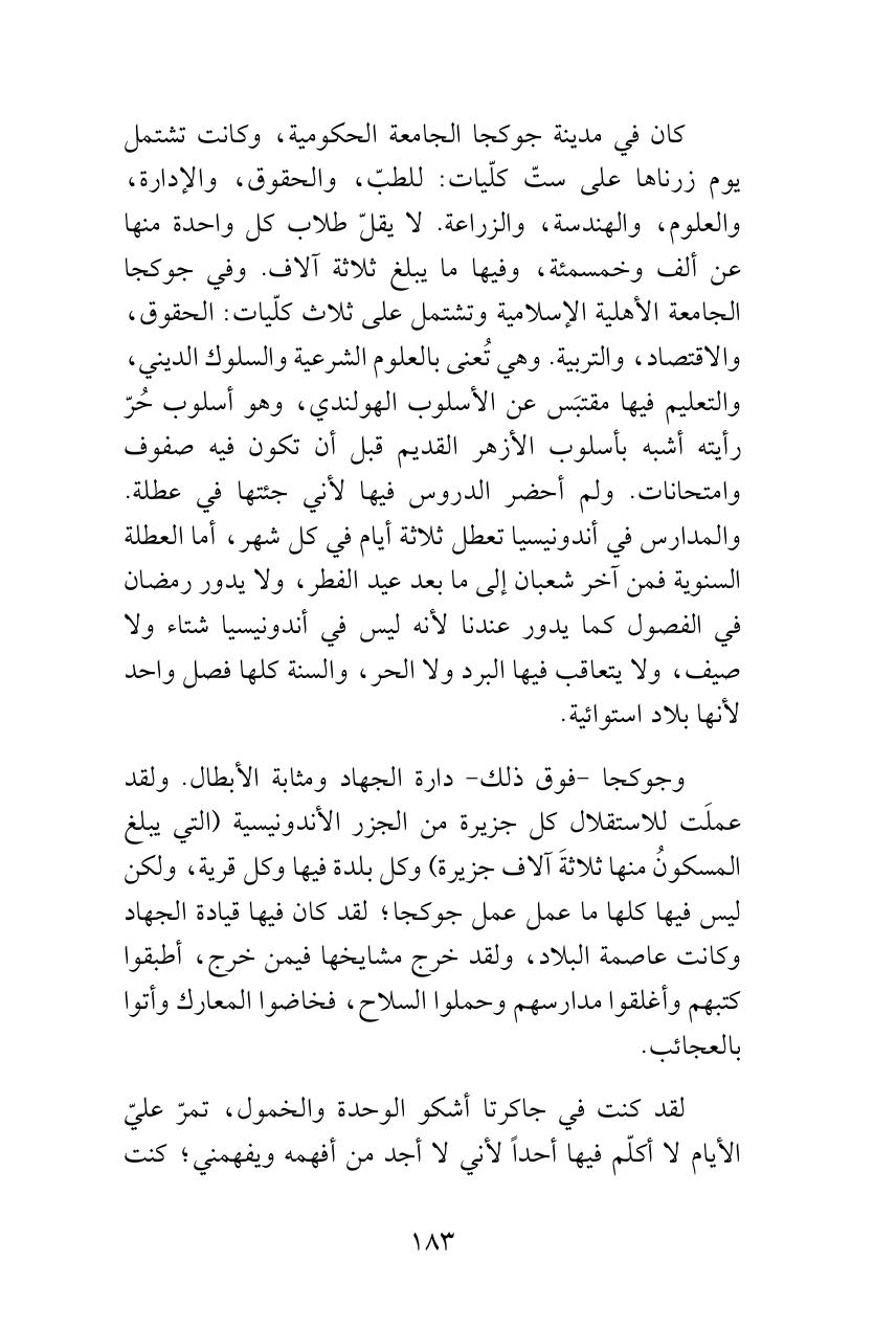 كان في مدينة جوكجا الجامعة الحكومية، وكانت تشتمل يوم زرناها على ستّ كلّيات: للطبّ، والحقوق، والإدارة، والعلوم، والهندسة، والزراعة. لا يقلّ طلاب كل واحدة منها عن ألف وخمسمئة، وفيها ما يبلغ ثلاثة آلاف. وفي جوكجا الجامعة الأهلية الإسلامية وتشتمل على ثلاث كلّيات: الحقوق، والاقتصاد، والتربية. وهي تُعنى بالعلوم الشرعية والسلوك الديني، والتعليم فيها مقتبَس عن الأسلوب الهولندي، وهو أسلوب حُرّ رأيته أشبه بأسلوب الأزهر القديم قبل أن تكون فيه صفوف وامتحانات. ولم أحضر الدروس فيها لأني جئتها في عطلة. والمدارس في أندونيسيا تعطل ثلاثة أيام في كل شهر، أما العطلة السنوية فمن آخر شعبان إلى ما بعد عيد الفطر، ولا يدور رمضان في الفصول كما يدور عندنا لأنه ليس في أندونيسيا شتاء ولا صيف، ولا يتعاقب فيها البرد ولا الحر، والسنة كلها فصل واحد لأنها بلاد استوائية.