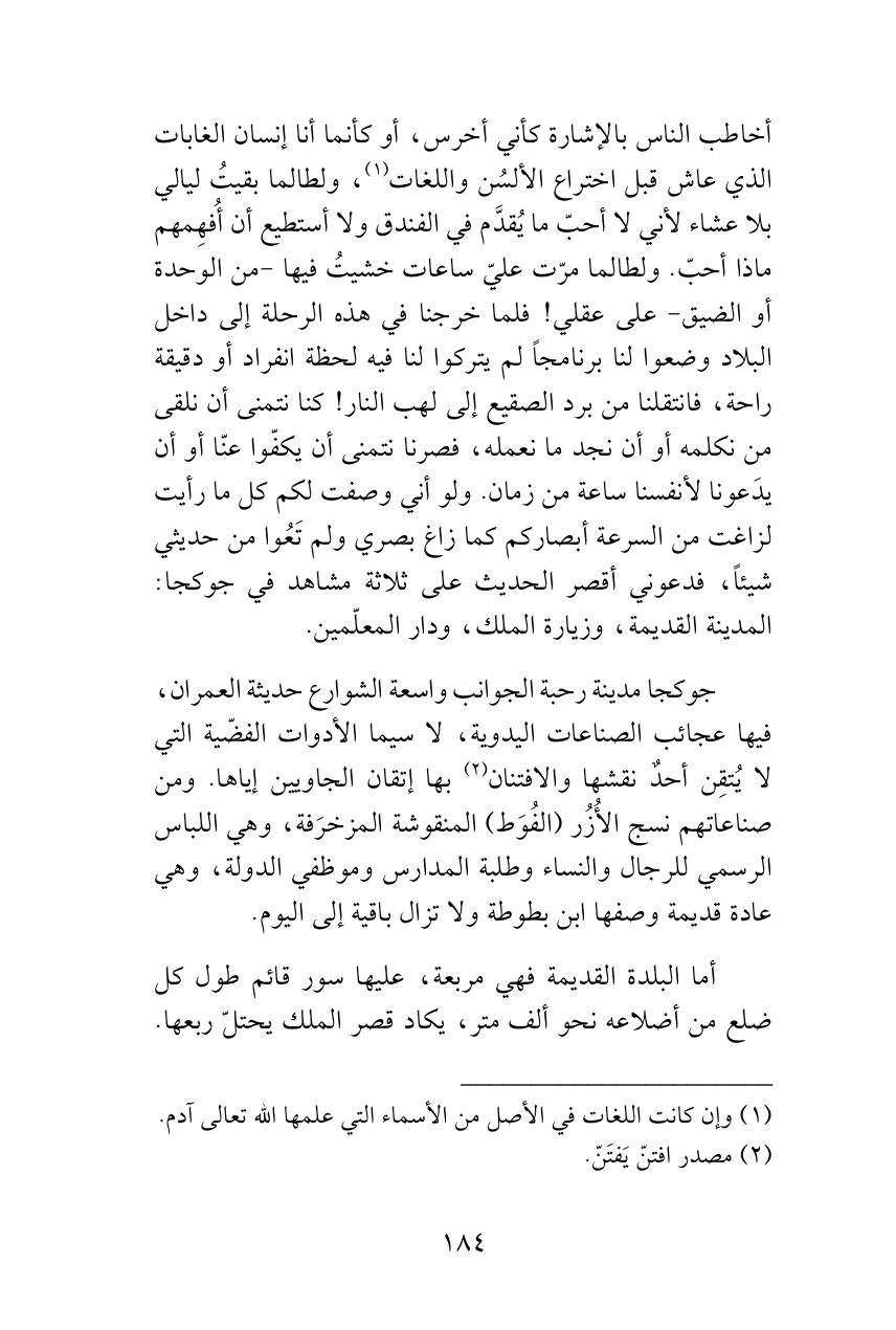 أخاطب الناس بالإشارة كأني أخرس، أو كأنما أنا إنسان الغابات الذي عاش قبل اختراع الألسُن واللغات (¬1)، ولطالما بقيتُ ليالي بلا عشاء لأني لا أحبّ ما يُقدَّم في الفندق ولا أستطيع أن أُفهِمهم ماذا أحبّ. ولطالما مرّت عليّ ساعات خشيتُ فيها -من الوحدة أو الضيق- على عقلي! فلما خرجنا في هذه الرحلة إلى داخل البلاد وضعوا لنا برنامجاً لم يتركوا لنا فيه لحظة انفراد أو دقيقة راحة، فانتقلنا من برد الصقيع إلى لهب النار! كنا نتمنى أن نلقى من نكلمه أو أن نجد ما نعمله، فصرنا نتمنى أن يكفّوا عنّا أو أن يدَعونا لأنفسنا ساعة من زمان. ولو أني وصفت لكم كل ما رأيت لزاغت من السرعة أبصاركم كما زاغ بصري ولم تَعُوا من حديثي شيئاً، فدعوني أقصر الحديث على ثلاثة مشاهد في جوكجا: المدينة القديمة، وزيارة الملك، ودار المعلّمين.