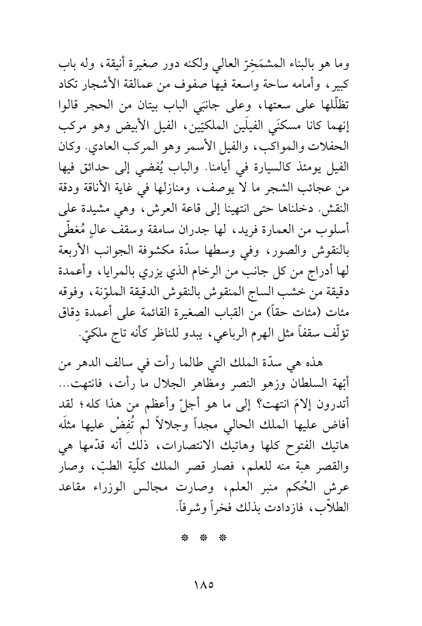 وما هو بالبناء المشمَخِرّ العالي ولكنه دور صغيرة أنيقة، وله باب كبير، وأمامه ساحة واسعة فيها صفوف من عمالقة الأشجار تكاد تظلّلها على سعتها، وعلى جانبَي الباب بيتان من الحجر قالوا إنهما كانا مسكنَي الفيلَين الملكيّين، الفيل الأبيض وهو مركب الحفلات والمواكب، والفيل الأسمر وهو المركب العادي. وكان الفيل يومئذ كالسيارة في أيامنا. والباب يُفضي إلى حدائق فيها من عجائب الشجر ما لا يوصف، ومنازلها في غاية الأناقة ودقة النقش. دخلناها حتى انتهينا إلى قاعة العرش، وهي مشيدة على أسلوب من العمارة فريد، لها جدران سامقة وسقف عالٍ مُغطّى بالنقوش والصور، وفي وسطها سدّة مكشوفة الجوانب الأربعة لها أدراج من كل جانب من الرخام الذي يزري بالمرايا، وأعمدة دقيقة من خشب الساج المنقوش بالنقوش الدقيقة الملوّنة، وفوقه مئات (مئات حقاً) من القباب الصغيرة القائمة على أعمدة دِقاق تؤلّف سقفاً مثل الهرم الرباعي، يبدو للناظر كأنه تاج ملكيّ.