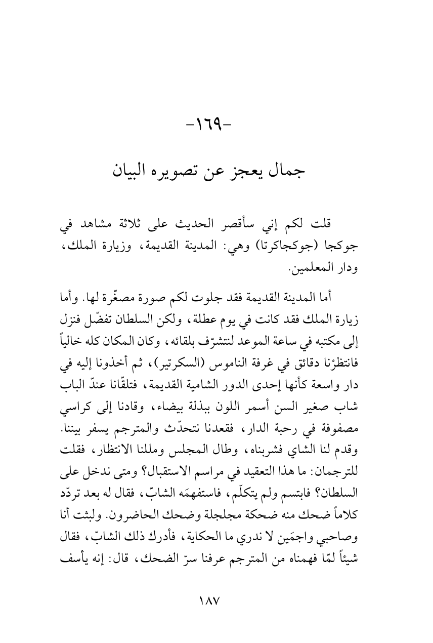 أما المدينة القديمة فقد جلوت لكم صورة مصغّرة لها. وأما زيارة الملك فقد كانت في يوم عطلة، ولكن السلطان تفضّل فنزل إلى مكتبه في ساعة الموعد لنتشرّف بلقائه، وكان المكان كله خالياً فانتظرْنا دقائق في غرفة الناموس (السكرتير)، ثم أخذونا إليه في دار واسعة كأنها إحدى الدور الشامية القديمة، فتلقّانا عندّ الباب شاب صغير السن أسمر اللون ببذلة بيضاء، وقادنا إلى كراسي مصفوفة في رحبة الدار، فقعدنا نتحدّث والمترجم يسفر بيننا. وقدم لنا الشاي فشربناه، وطال المجلس ومللنا الانتظار، فقلت للترجمان: ما هذا التعقيد في مراسم الاستقبال؟ ومتى ندخل على السلطان؟ فابتسم ولم يتكلّم، فاستفهمَه الشابّ، فقال له بعد تردّد كلاماً ضحك منه ضحكة مجلجلة وضحك الحاضرون. ولبثت أنا وصاحبي واجمَين لا ندري ما الحكاية، فأدرك ذلك الشابّ، فقال شيئاً لمّا فهمناه من المترجم عرفنا سرّ الضحك، قال: إنه يأسف