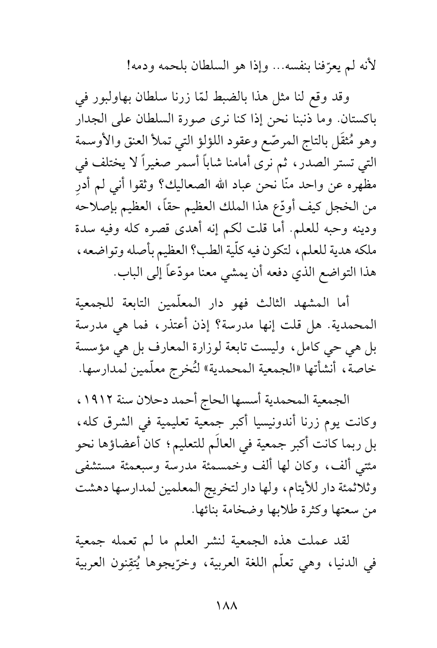 وقد وقع لنا مثل هذا بالضبط لمّا زرنا سلطان بهاولبور في باكستان. وما ذنبنا نحن إذا كنا نرى صورة السلطان على الجدار وهو مُثقَل بالتاج المرصّع وعقود اللؤلؤ التي تملأ العنق والأوسمة التي تستر الصدر، ثم نرى أمامنا شاباً أسمر صغيراً لا يختلف في مظهره عن واحد منّا نحن عباد الله الصعاليك؟ وثقوا أني لم أدرِ من الخجل كيف أودّع هذا الملك العظيم حقاً، العظيم بإصلاحه ودينه وحبه للعلم. أما قلت لكم إنه أهدى قصره كله وفيه سدة ملكه هدية للعلم، لتكون فيه كلّية الطب؟ العظيم بأصله وتواضعه، هذا التواضع الذي دفعه أن يمشي معنا مودّعاً إلى الباب.
