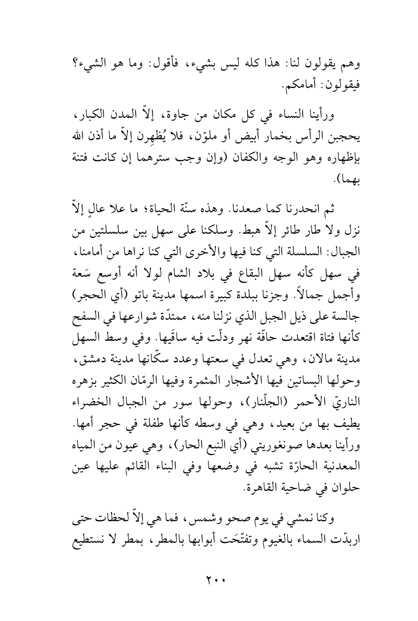 ثم انحدرنا كما صعدنا. وهذه سنّة الحياة؛ ما علا عالٍ إلاّ نزل ولا طار طائر إلاّ هبط. وسلكنا على سهل بين سلسلتين من الجبال: السلسلة التي كنا فيها والأخرى التي كنا نراها من أمامنا، في سهل كأنه سهل البقاع في بلاد الشام لولا أنه أوسع سَعة وأجمل جمالاً. وجزنا ببلدة كبيرة اسمها مدينة باتو (أي الحجر) جالسة على ذيل الجبل الذي نزلنا منه، ممتدّة شوارعها في السفح كأنها فتاة اقتعدت حافّة نهر ودلّت فيه ساقَيها. وفي وسط السهل مدينة مالان، وهي تعدل في سعتها وعدد سكّانها مدينة دمشق، وحولها البساتين فيها الأشجار المثمرة وفيها الرمّان الكثير بزهره الناريّ الأحمر (الجلّنار)، وحولها سور من الجبال الخضراء يطيف بها من بعيد، وهي في وسطه كأنها طفلة في حجر أمها. ورأينا بعدها صونغوريتي (أي النبع الحار)، وهي عيون من المياه المعدنية الحارّة تشبه في وضعها وفي البناء القائم عليها عين حلوان في ضاحية القاهرة.