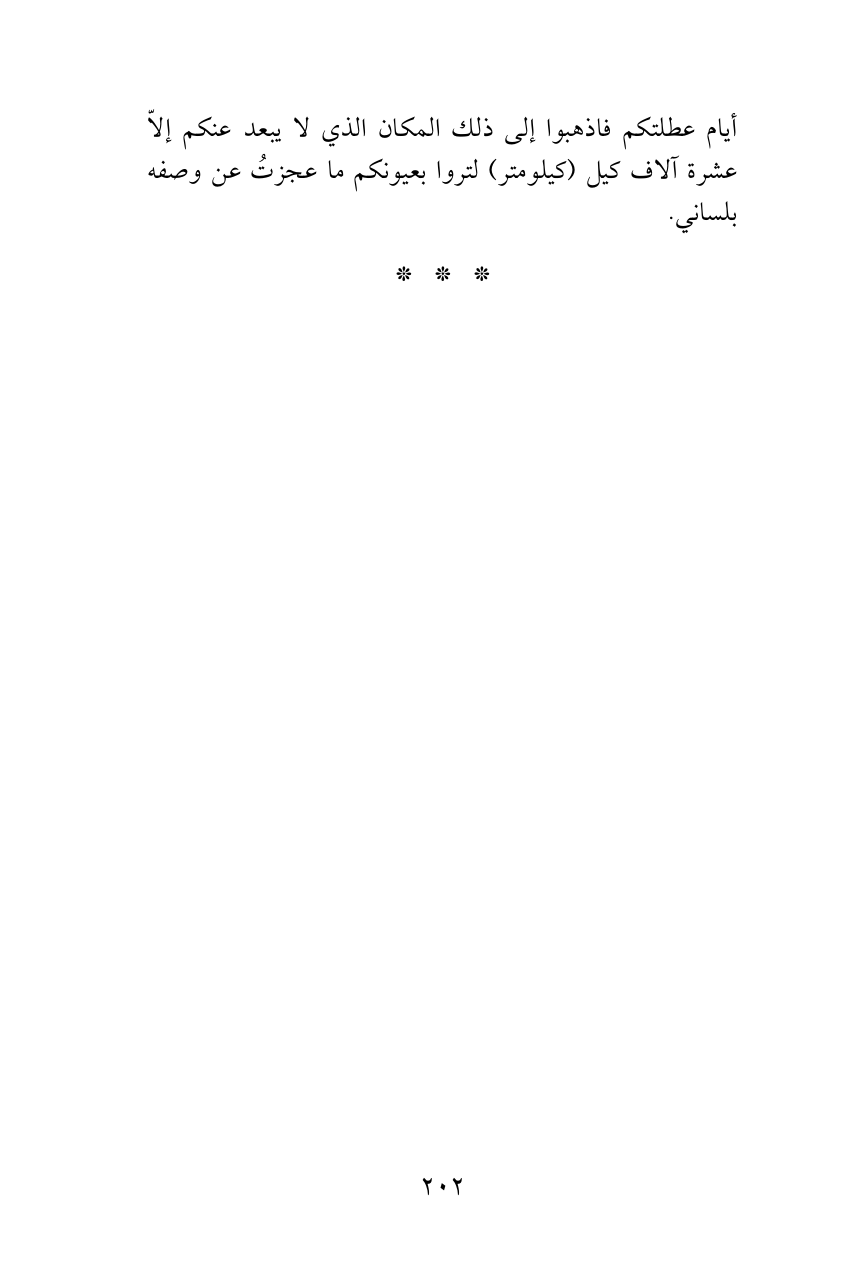 أيام عطلتكم فاذهبوا إلى ذلك المكان الذي لا يبعد عنكم إلاّ عشرة آلاف كيل (كيلومتر) لتروا بعيونكم ما عجزتُ عن وصفه بلساني.