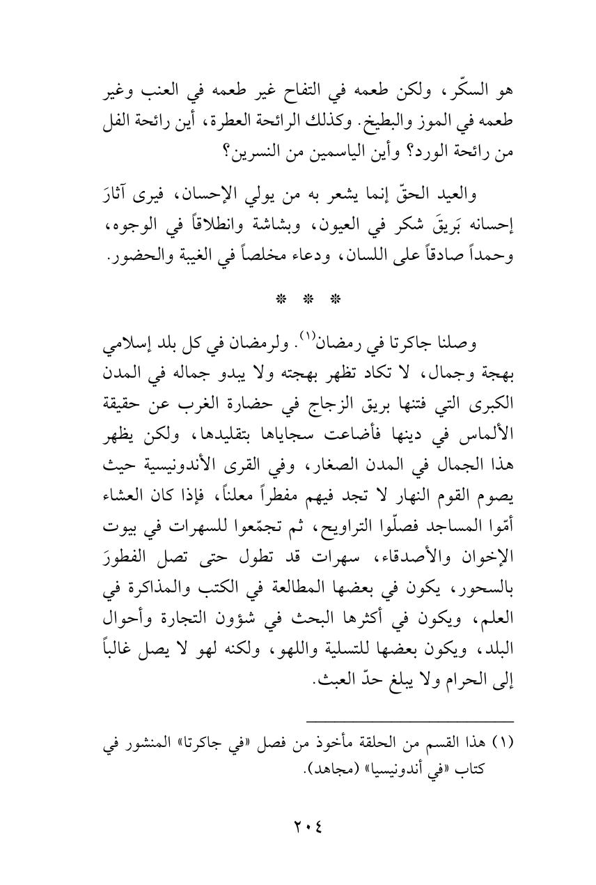 وصلنا جاكرتا في رمضان (¬1). ولرمضان في كل بلد إسلامي بهجة وجمال، لا تكاد تظهر بهجته ولا يبدو جماله في المدن الكبرى التي فتنها بريق الزجاج في حضارة الغرب عن حقيقة الألماس في دينها فأضاعت سجاياها بتقليدها، ولكن يظهر هذا الجمال في المدن الصغار، وفي القرى الأندونيسية حيث يصوم القوم النهار لا تجد فيهم مفطراً معلناً، فإذا كان العشاء أمّوا المساجد فصلّوا التراويح، ثم تجمّعوا للسهرات في بيوت الإخوان والأصدقاء، سهرات قد تطول حتى تصل الفطورَ بالسحور، يكون في بعضها المطالعة في الكتب والمذاكرة في العلم، ويكون في أكثرها البحث في شؤون التجارة وأحوال البلد، ويكون بعضها للتسلية واللهو، ولكنه لهو لا يصل غالباً إلى الحرام ولا يبلغ حدّ العبث.