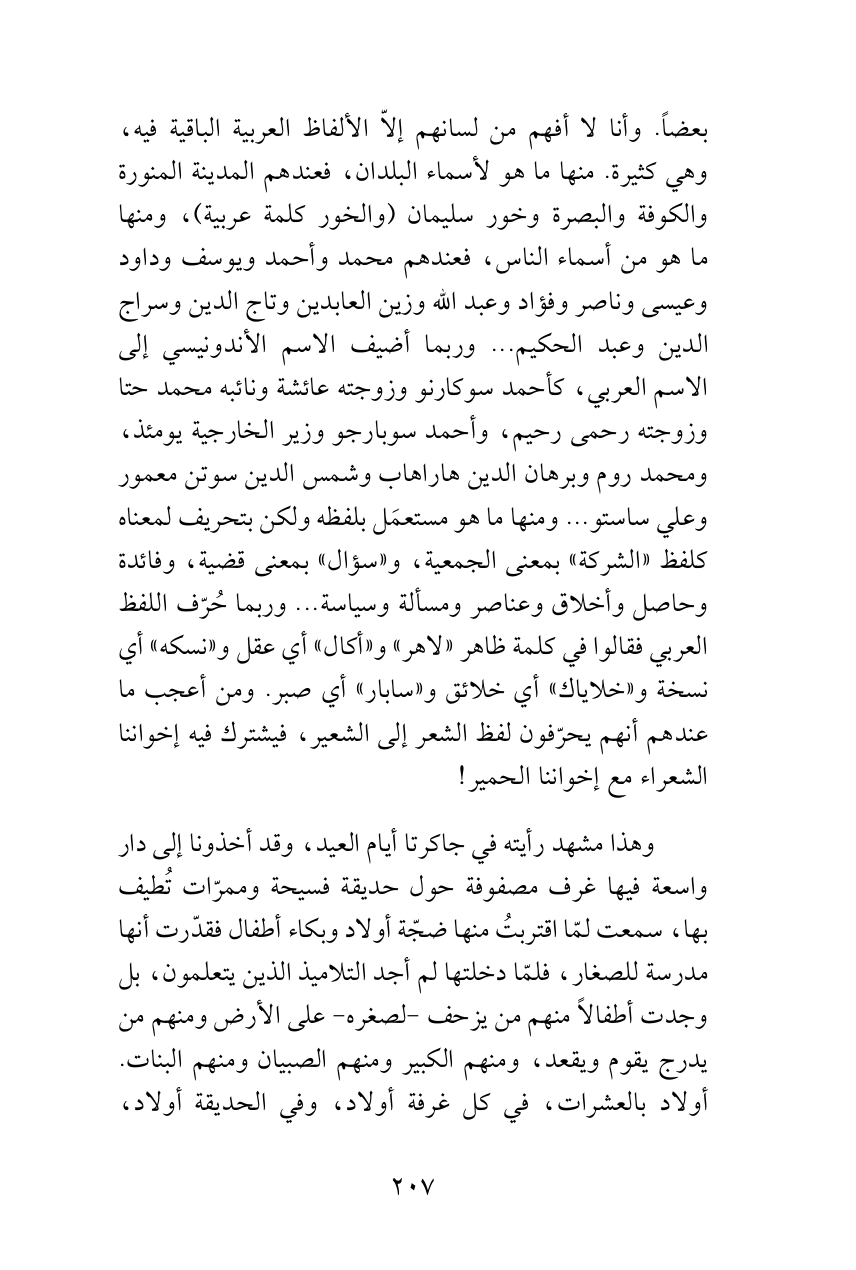 بعضاً. وأنا لا أفهم من لسانهم إلاّ الألفاظ العربية الباقية فيه، وهي كثيرة. منها ما هو لأسماء البلدان، فعندهم المدينة المنورة والكوفة والبصرة وخور سليمان (والخور كلمة عربية)، ومنها ما هو من أسماء الناس، فعندهم محمد وأحمد ويوسف وداود وعيسى وناصر وفؤاد وعبد الله وزين العابدين وتاج الدين وسراج الدين وعبد الحكيم ... وربما أضيف الاسم الأندونيسي إلى الاسم العربي، كأحمد سوكارنو وزوجته عائشة ونائبه محمد حتا وزوجته رحمى رحيم، وأحمد سوبارجو وزير الخارجية يومئذ، ومحمد روم وبرهان الدين هاراهاب وشمس الدين سوتن معمور وعلي ساستو ... ومنها ما هو مستعمَل بلفظه ولكن بتحريف لمعناه كلفظ «الشركة» بمعنى الجمعية، و «سؤال» بمعنى قضية، وفائدة وحاصل وأخلاق وعناصر ومسألة وسياسة ... وربما حُرّف اللفظ العربي فقالوا في كلمة ظاهر «لاهر» و «أكال» أي عقل و «نسكه» أي نسخة و «خلاياك» أي خلائق و «سابار» أي صبر. ومن أعجب ما عندهم أنهم يحرّفون لفظ الشعر إلى الشعير، فيشترك فيه إخواننا الشعراء مع إخواننا الحمير!