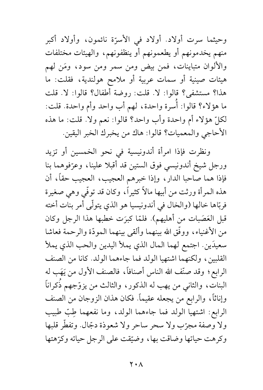 ونظرت فإذا امرأة أندونيسية في نحو الخمسين أو تزيد ورجل شيخ أندونيسي فوق الستين قد أقبلا علينا، وعرّفوهما بنا فإذا هما صاحبا الدار، وإذا خبرهم العجيب، العجيب حقاً، أن هذه المرأة ورثت من أبيها مالاً كثيراً، وكان قد توفّي وهي صغيرة فربّاها خالها (والخال في أندونيسيا هو الذي يتولّى أمر بنات أخته قبل العَصَبات من أهليهم). فلمّا كبرَت خطبها هذا الرجل وكان من الأغنياء، ووفّق الله بينهما وألقى بينهما المودّة والرحمة فعاشا سعيدَين. اجتمع لهما المال الذي يملأ اليدين والحب الذي يملأ القلبين، ولكنهما اشتهيا الولد فما جاءهما الولد. كانا من الصنف الرابع؛ وقد صنّف الله الناس أصنافاً، فالصنف الأول من يَهَب له البنات، والثاني من يهب له الذكور، والثالث من يزوّجهم ذُكراناً وإناثاً، والرابع من يجعله عقيماً. فكان هذان الزوجان من الصنف الرابع: اشتهيا الولد فما جاءهما الولد، وما نفعهما طِبّ طبيب ولا وصفة مجرّب ولا سحر ساحر ولا شعوذة دجّال. وتفطّر قلبها وكرهت حياتها وضاقت بها، وضيّقت على الرجل حياته وكرّهتها
