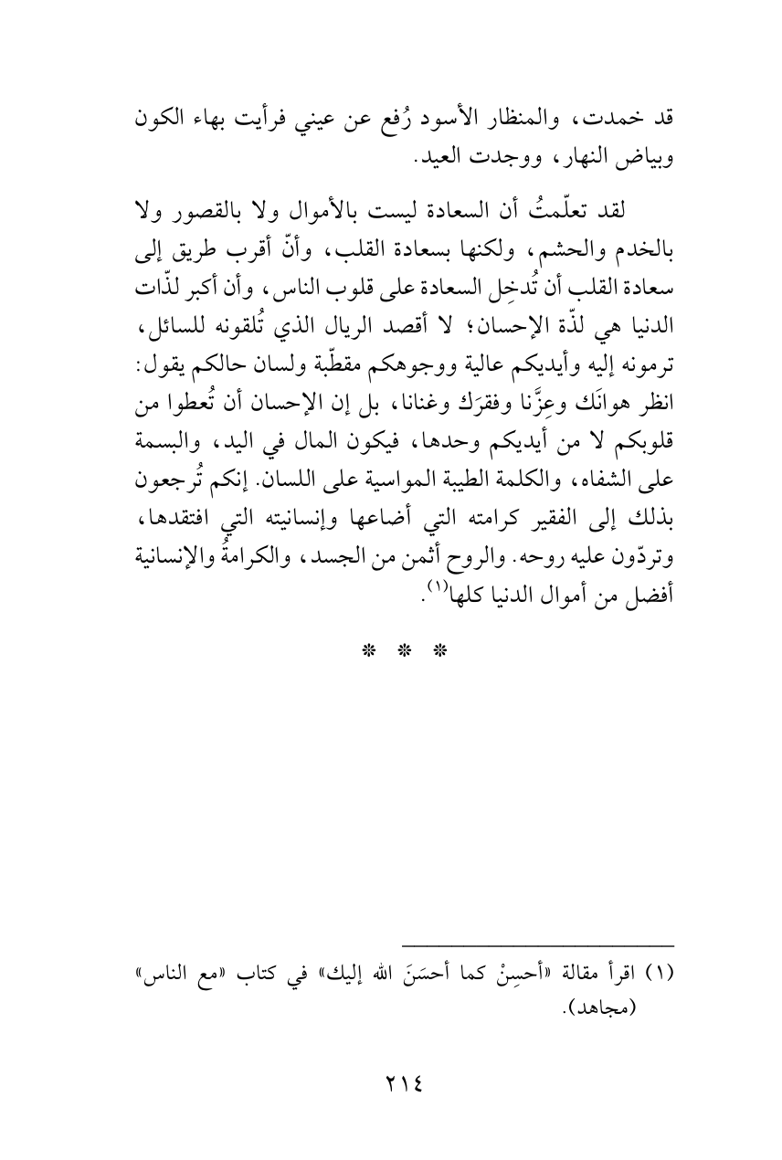 لقد تعلّمتُ أن السعادة ليست بالأموال ولا بالقصور ولا بالخدم والحشم، ولكنها بسعادة القلب، وأنّ أقرب طريق إلى سعادة القلب أن تُدخِل السعادة على قلوب الناس، وأن أكبر لذّات الدنيا هي لذّة الإحسان؛ لا أقصد الريال الذي تُلقونه للسائل، ترمونه إليه وأيديكم عالية ووجوهكم مقطّبة ولسان حالكم يقول: انظر هوانَك وعِزَّنا وفقرَك وغنانا، بل إن الإحسان أن تُعطوا من قلوبكم لا من أيديكم وحدها، فيكون المال في اليد، والبسمة على الشفاه، والكلمة الطيبة المواسية على اللسان. إنكم تُرجعون بذلك إلى الفقير كرامته التي أضاعها وإنسانيته التي افتقدها، وتردّون عليه روحه. والروح أثمن من الجسد، والكرامةُ والإنسانية أفضل من أموال الدنيا كلها (¬1).