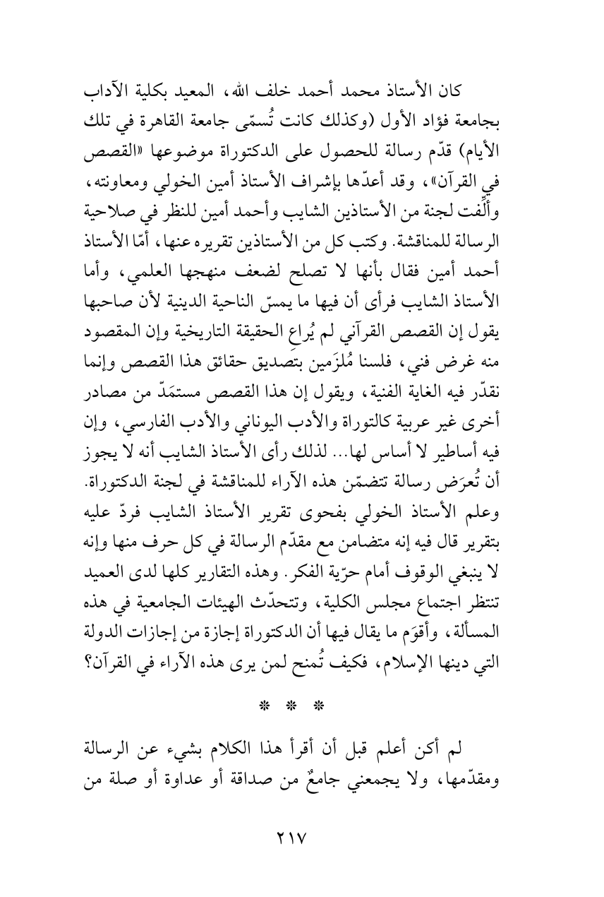 كان الأستاذ محمد أحمد خلف الله، المعيد بكلية الآداب بجامعة فؤاد الأول (وكذلك كانت تُسمّى جامعة القاهرة في تلك الأيام) قدّم رسالة للحصول على الدكتوراة موضوعها «القصص في القرآن»، وقد أعدّها بإشراف الأستاذ أمين الخولي ومعاونته، وألِّفت لجنة من الأستاذين الشايب وأحمد أمين للنظر في صلاحية الرسالة للمناقشة. وكتب كل من الأستاذين تقريره عنها، أمّا الأستاذ أحمد أمين فقال بأنها لا تصلح لضعف منهجها العلمي، وأما الأستاذ الشايب فرأى أن فيها ما يمسّ الناحية الدينية لأن صاحبها يقول إن القصص القرآني لم يُراعِ الحقيقة التاريخية وإن المقصود منه غرض فني، فلسنا مُلزَمين بتصديق حقائق هذا القصص وإنما نقدّر فيه الغاية الفنية، ويقول إن هذا القصص مستمَدّ من مصادر أخرى غير عربية كالتوراة والأدب اليوناني والأدب الفارسي، وإن فيه أساطير لا أساس لها ... لذلك رأى الأستاذ الشايب أنه لا يجوز أن تُعرَض رسالة تتضمّن هذه الآراء للمناقشة في لجنة الدكتوراة. وعلم الأستاذ الخولي بفحوى تقرير الأستاذ الشايب فردّ عليه بتقرير قال فيه إنه متضامن مع مقدّم الرسالة في كل حرف منها وإنه لا ينبغي الوقوف أمام حرّية الفكر. وهذه التقارير كلها لدى العميد تنتظر اجتماع مجلس الكلية، وتتحدّث الهيئات الجامعية في هذه المسألة، وأقوَم ما يقال فيها أن الدكتوراة إجازة من إجازات الدولة التي دينها الإسلام، فكيف تُمنح لمن يرى هذه الآراء في القرآن؟