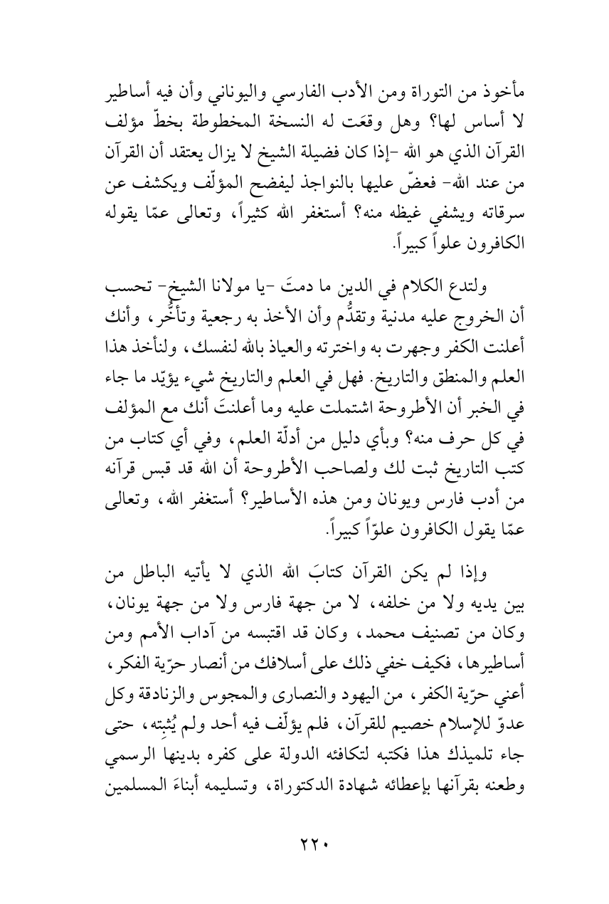 وإذا لم يكن القرآن كتابَ الله الذي لا يأتيه الباطل من بين يديه ولا من خلفه، لا من جهة فارس ولا من جهة يونان، وكان من تصنيف محمد، وكان قد اقتبسه من آداب الأمم ومن أساطيرها، فكيف خفي ذلك على أسلافك من أنصار حرّية الفكر، أعني حرّية الكفر، من اليهود والنصارى والمجوس والزنادقة وكل عدوّ للإسلام خصيم للقرآن، فلم يؤلّف فيه أحد ولم يُثبِته، حتى جاء تلميذك هذا فكتبه لتكافئه الدولة على كفره بدينها الرسمي وطعنه بقرآنها بإعطائه شهادة الدكتوراة، وتسليمه أبناءَ المسلمين