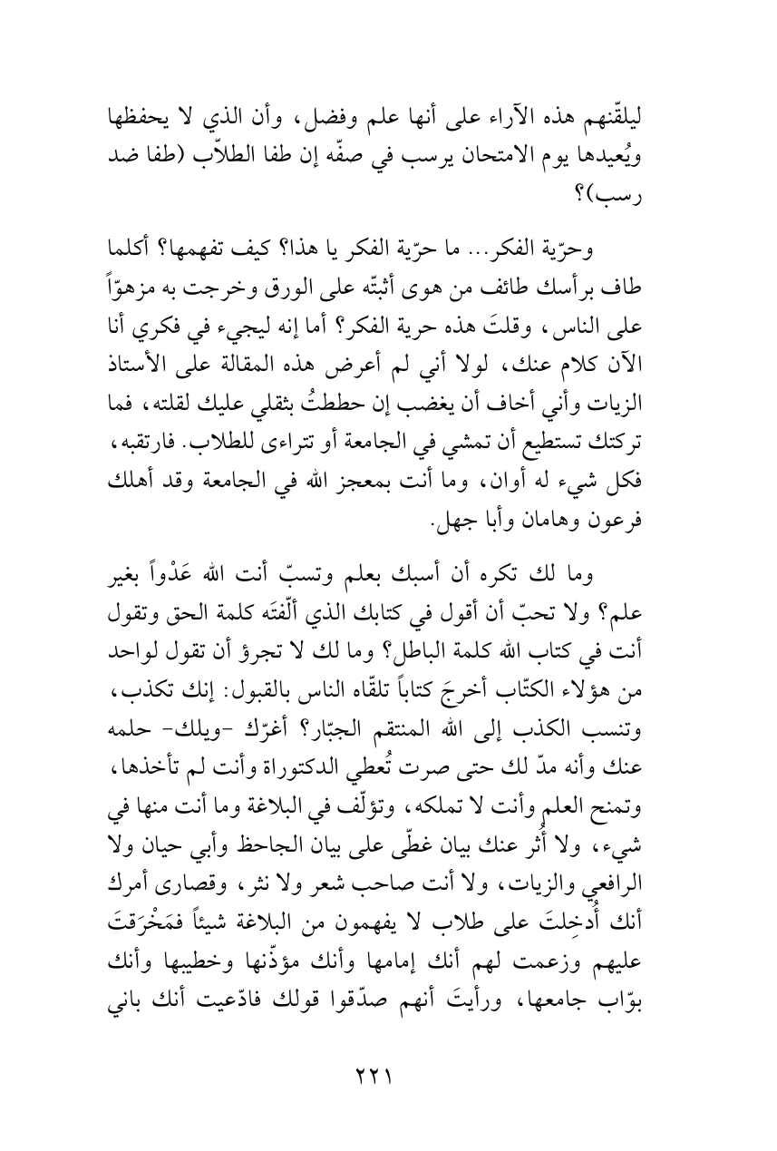 وحرّية الفكر ... ما حرّية الفكر يا هذا؟ كيف تفهمها؟ أكلما طاف برأسك طائف من هوى أثبتّه على الورق وخرجت به مزهوّاً على الناس، وقلتَ هذه حرية الفكر؟ أما إنه ليجيء في فكري أنا الآن كلام عنك، لولا أني لم أعرض هذه المقالة على الأستاذ الزيات وأني أخاف أن يغضب إن حططتُ بثقلي عليك لقلته، فما تركتك تستطيع أن تمشي في الجامعة أو تتراءى للطلاب. فارتقبه، فكل شيء له أوان، وما أنت بمعجز الله في الجامعة وقد أهلك فرعون وهامان وأبا جهل.