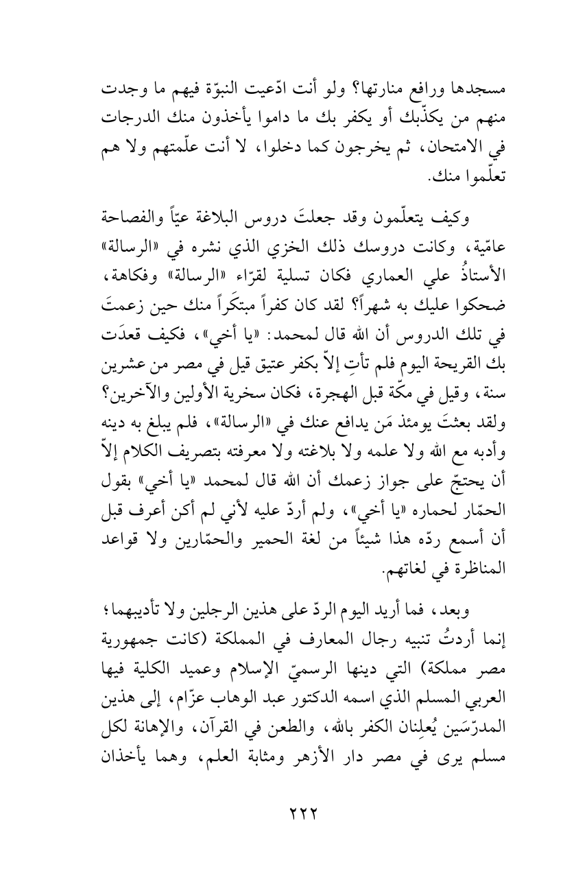 وكيف يتعلّمون وقد جعلتَ دروس البلاغة عيّاً والفصاحة عامّية، وكانت دروسك ذلك الخزي الذي نشره في «الرسالة» الأستاذُ علي العماري فكان تسلية لقرّاء «الرسالة» وفكاهة، ضحكوا عليك به شهراً؟ لقد كان كفراً مبتكَراً منك حين زعمتَ في تلك الدروس أن الله قال لمحمد: «يا أخي»، فكيف قعدَت بك القريحة اليوم فلم تأتِ إلاّ بكفر عتيق قيل في مصر من عشرين سنة، وقيل في مكّة قبل الهجرة، فكان سخرية الأولين والآخرين؟ ولقد بعثتَ يومئذ مَن يدافع عنك في «الرسالة»، فلم يبلغ به دينه وأدبه مع الله ولا علمه ولا بلاغته ولا معرفته بتصريف الكلام إلاّ أن يحتجّ على جواز زعمك أن الله قال لمحمد «يا أخي» بقول الحمّار لحماره «يا أخي»، ولم أردّ عليه لأني لم أكن أعرف قبل أن أسمع ردّه هذا شيئاً من لغة الحمير والحمّارين ولا قواعد المناظرة في لغاتهم.