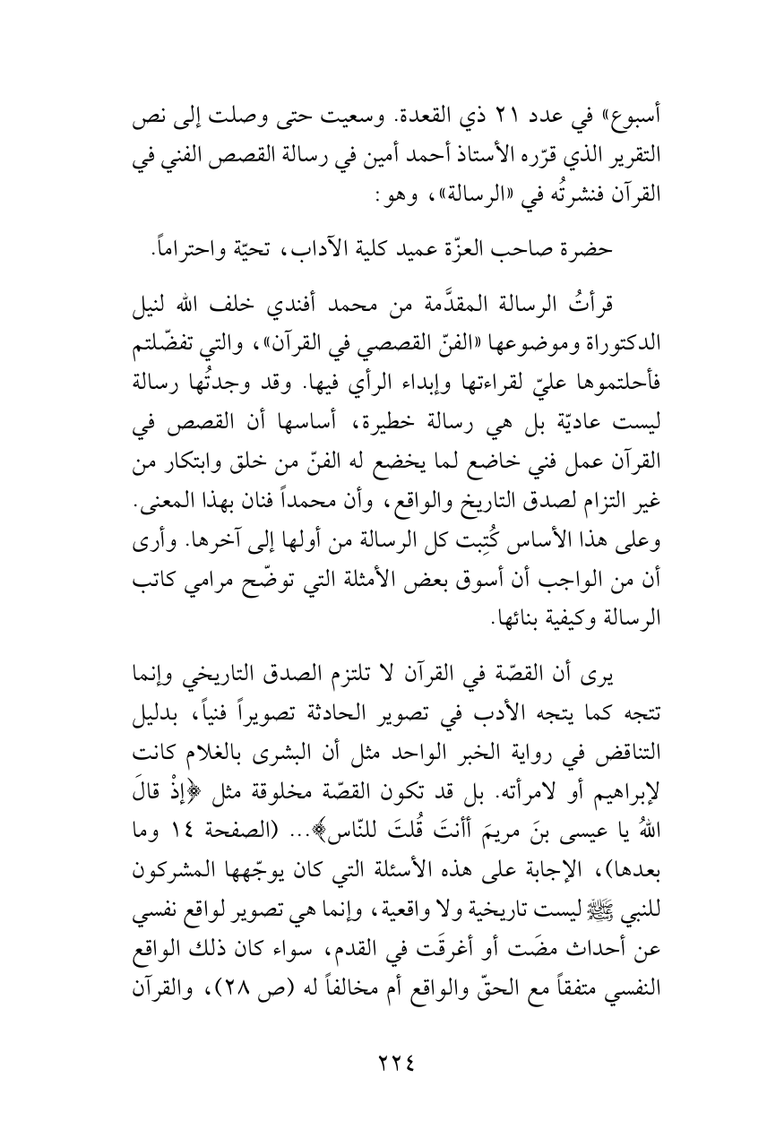 أسبوع» في عدد 21 ذي القعدة. وسعيت حتى وصلت إلى نص التقرير الذي قرّره الأستاذ أحمد أمين في رسالة القصص الفني في القرآن فنشرتُه في «الرسالة»، وهو: