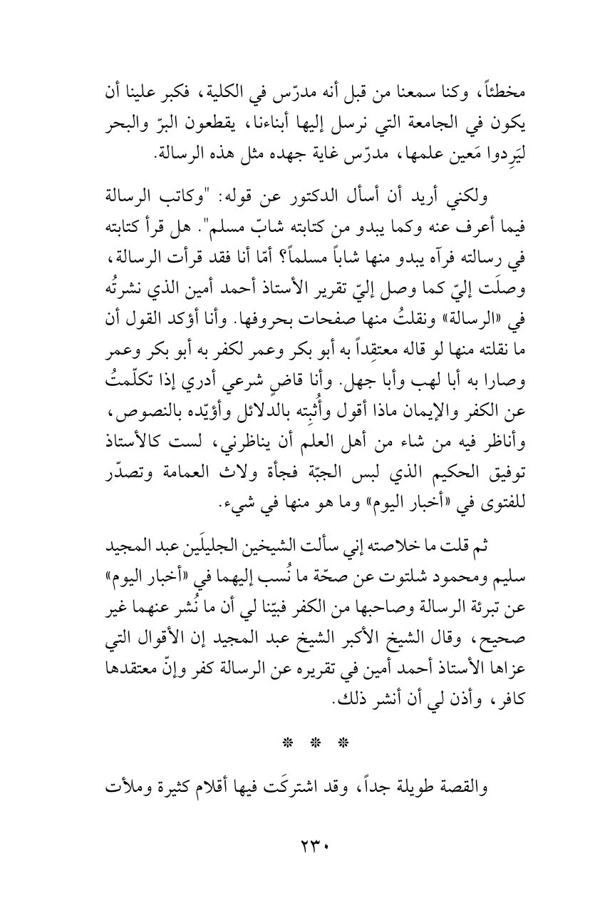 ثم قلت ما خلاصته إني سألت الشيخين الجليلَين عبدالمجيد سليم ومحمود شلتوت عن صحّة ما نُسب إليهما في «أخبار اليوم» عن تبرئة الرسالة وصاحبها من الكفر فبيّنا لي أن ما نُشر عنهما غير صحيح، وقال الشيخ الأكبر الشيخ عبد المجيد إن الأقوال التي عزاها الأستاذ أحمد أمين في تقريره عن الرسالة كفر وإنّ معتقدها كافر، وأذن لي أن أنشر ذلك.