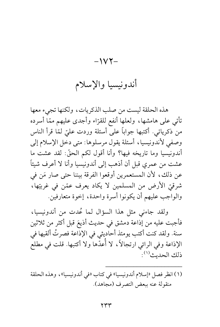 هذه الحلقة ليست من صلب الذكريات، ولكنها تجيء معها تأتي على هامشها، ولعلها أنفع للقرّاء وأجدى عليهم ممّا أسرده من ذكرياتي. أكتبها جواباً على أسئلة وردت عليّ لمّا قرأ الناس وصفي لأندونيسيا، أسئلة يقول مرسلوها: متى دخل الإسلام إلى أندونيسيا وما تاريخه فيها؟ وأنا أقول لكم الحقّ: لقد عشت ما عشت من عمري قبل أن أذهب إلى أندونيسيا وأنا لا أعرف شيئاً عن ذلك، لأن المستعمرين أوقعوا الفرقة بيننا حتى صار مَن في شرقيّ الأرض من المسلمين لا يكاد يعرف عمّن في غربيّها، والواجب عليهم أن يكونوا أسرة واحدة، إخوة متعارفين.