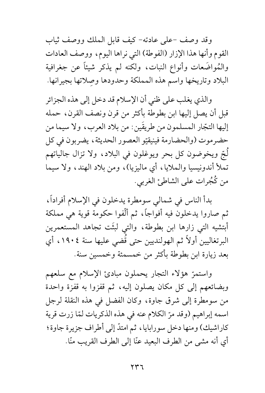 والذي يغلب على ظني أن الإسلام قد دخل إلى هذه الجزائر قبل أن يصل إليها ابن بطوطة بأكثر من قرن ونصف القرن، حمله إليها التجّار المسلمون من طريقَين: من بلاد العرب، ولا سيما من حضرموت (والحضارمة فينيقيّو العصور الحديثة، يضربون في كل لُجّ ويخوضون كل بحر ويوغلون في البلاد، ولا تزال جالياتهم تملأ أندونيسيا والملايا، أي ماليزيا)، ومن بلاد الهند، ولا سيما من كُجُرات على الشاطئ الغربي.