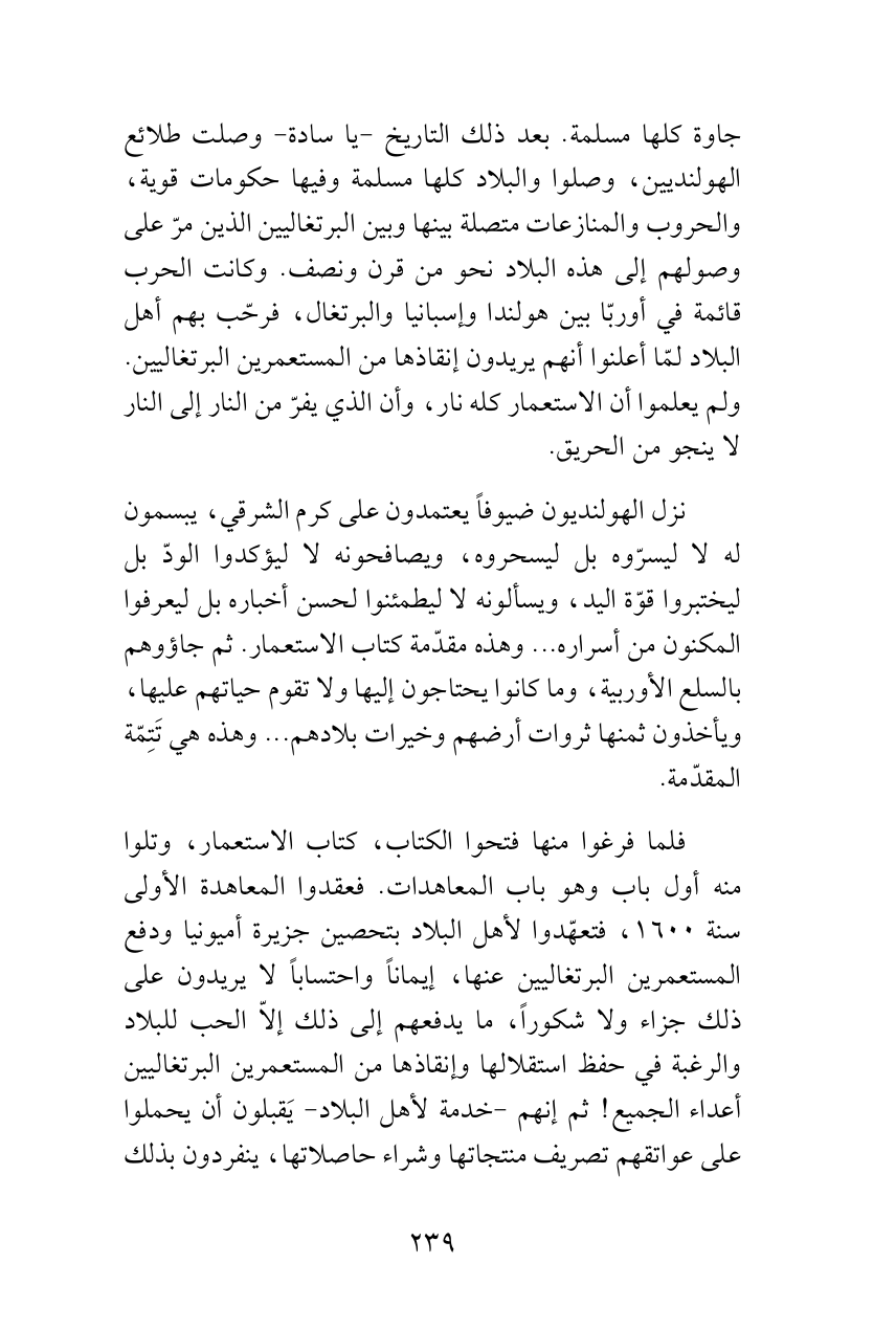نزل الهولنديون ضيوفاً يعتمدون على كرم الشرقي، يبسمون له لا ليسرّوه بل ليسحروه، ويصافحونه لا ليؤكدوا الودّ بل ليختبروا قوّة اليد، ويسألونه لا ليطمئنوا لحسن أخباره بل ليعرفوا المكنون من أسراره ... وهذه مقدّمة كتاب الاستعمار. ثم جاؤوهم بالسلع الأوربية، وما كانوا يحتاجون إليها ولا تقوم حياتهم عليها، ويأخذون ثمنها ثروات أرضهم وخيرات بلادهم ... وهذه هي تَتِمّة المقدّمة.