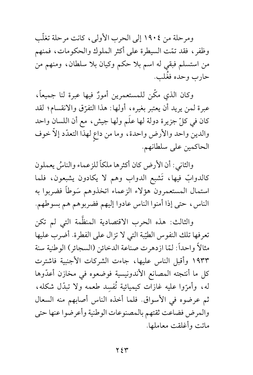 والثالث: هذه الحرب الاقتصادية المنظَّمة التي لم تكن تعرفها تلك النفوس الطيّبة التي لا تزال على الفطرة. أضرب عليها مثالاً واحداً: لمّا ازدهرت صناعة الدخائن (السجائر) الوطنية سنة 1933 وأقبل الناس عليها، جاءت الشركات الأجنبية فاشترت كل ما أنتجته المصانع الأندونيسية فوضعوه في مخازن أعدّوها له، وأمرّوا عليه غازات كيميائية تُفسِد طعمه ولا تبدّل شكله، ثم عرضوه في الأسواق. فلما أخذه الناس أصابهم منه السعال والمرض فضاعت ثقتهم بالمصنوعات الوطنية وأعرضوا عنها حتى ماتت وأغلقت معاملها.
