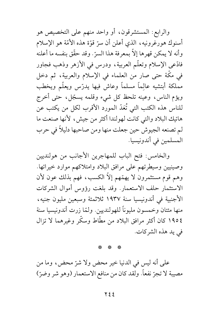 على أنه ليس في الدنيا خير محض ولا شرّ محض، وما من مصيبة لا تجرّ نفعاً. ولقد كان من منافع الاستعمار (وهو شر وضرّ)