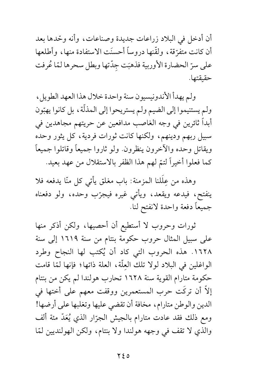 ولم يهدأ الأندونيسيون سنة واحدة خلال هذا العهد الطويل، ولم يستنيموا إلى الضيم ولم يستريحوا إلى المذلّة، بل كانوا يهبّون أبداً ثائرين في وجه الغاصب مدافعين عن حريتهم مجاهدين في سبيل ربهم ودينهم، ولكنها كانت ثورات فردية، كل يثور وحده ويقاتل وحده والآخرون ينظرون. ولو ثاروا جميعاً وقاتلوا جميعاً كما فعلوا أخيراً لتمّ لهم هذا الظفر بالاستقلال من عهد بعيد.