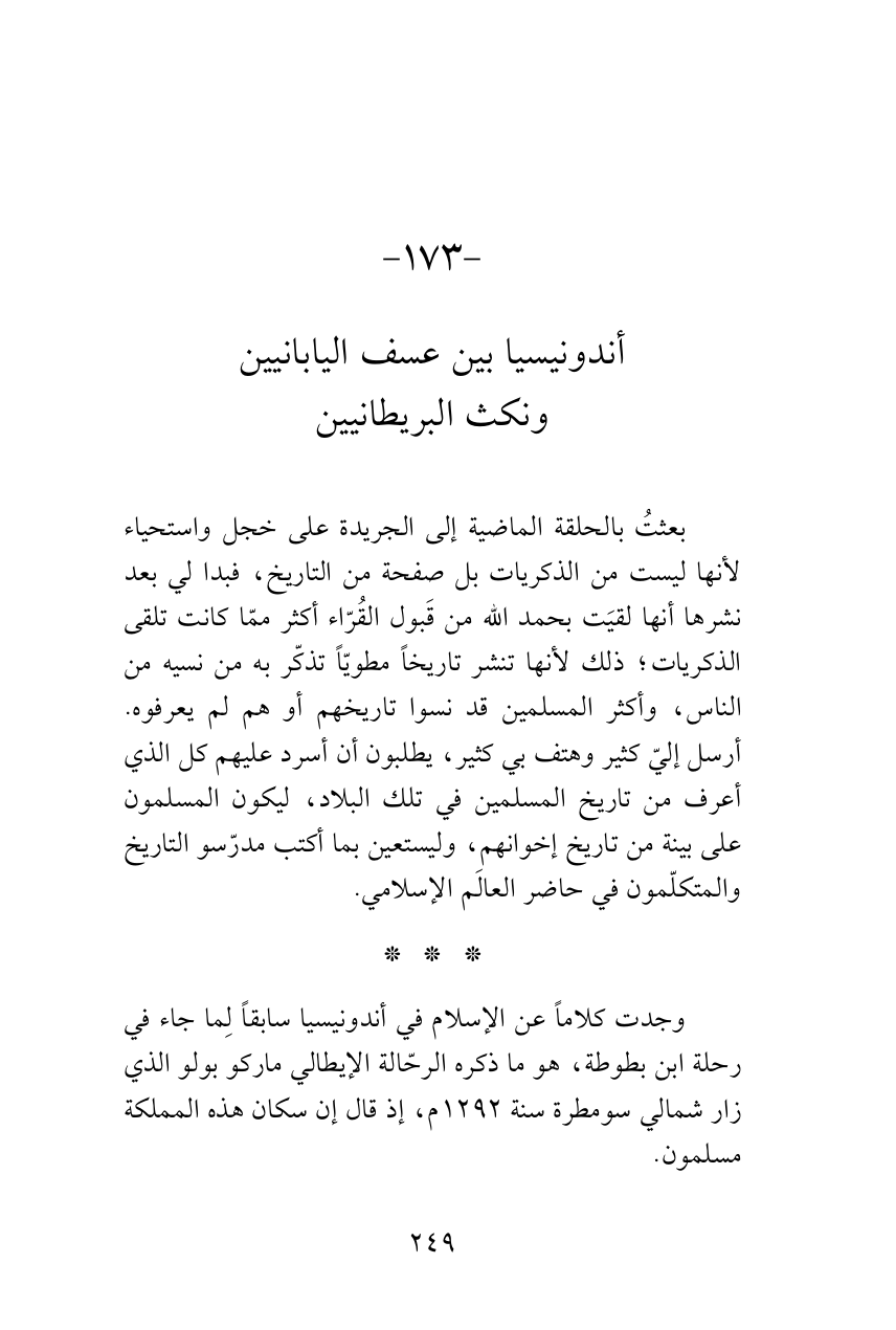 بعثتُ بالحلقة الماضية إلى الجريدة على خجل واستحياء لأنها ليست من الذكريات بل صفحة من التاريخ، فبدا لي بعد نشرها أنها لقيَت بحمد الله من قَبول القُرّاء أكثر ممّا كانت تلقى الذكريات؛ ذلك لأنها تنشر تاريخاً مطويّاً تذكّر به من نسيه من الناس، وأكثر المسلمين قد نسوا تاريخهم أو هم لم يعرفوه. أرسل إليّ كثير وهتف بي كثير، يطلبون أن أسرد عليهم كل الذي أعرف من تاريخ المسلمين في تلك البلاد، ليكون المسلمون على بينة من تاريخ إخوانهم، وليستعين بما أكتب مدرّسو التاريخ والمتكلّمون في حاضر العالَم الإسلامي.
