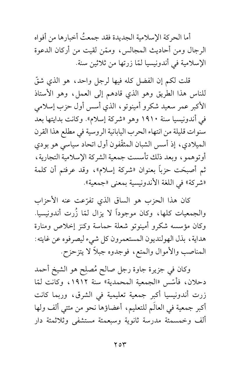 كان هذا الحزب هو الساق الذي تفرّعت عنه الأحزاب والجمعيات كلها، وكان موجوداً لا يزال لمّا زُرت أندونيسيا. وكان مؤسسه شكرو أمينوتو شعلة حماسة وكنز إخلاص ومنارة هداية، بذل الهولنديون المستعمرون كل شيء ليصرفوه عن غايته: المناصب والأموال والمتع، فوجدوه جبلاً لا يتزحزح.