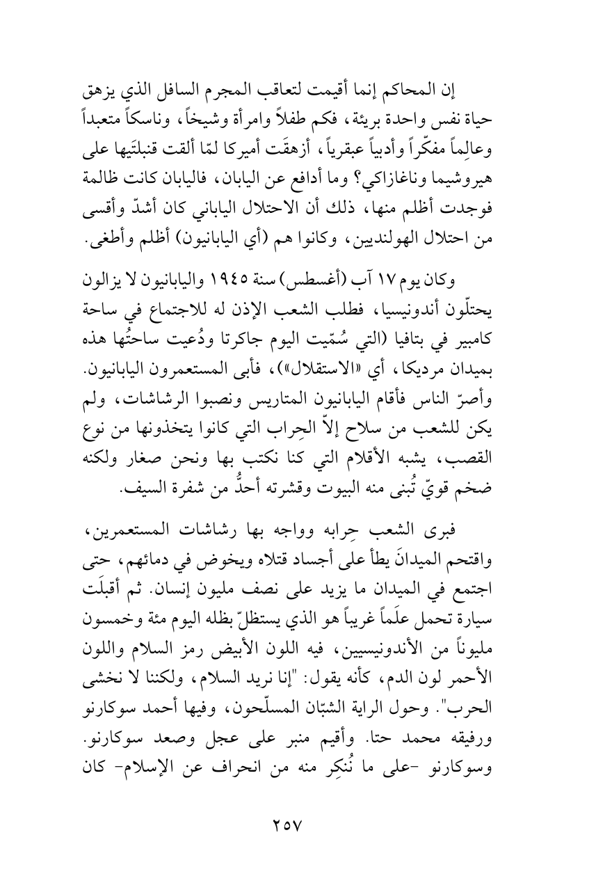 إن المحاكم إنما أقيمت لتعاقب المجرم السافل الذي يزهق حياة نفس واحدة بريئة، فكم طفلاً وامرأة وشيخاً، وناسكاً متعبداً وعالِماً مفكّراً وأدبياً عبقرياً، أزهقَت أميركا لمّا ألقت قنبلتَيها على هيروشيما وناغازاكي؟ وما أدافع عن اليابان، فاليابان كانت ظالمة فوجدت أظلم منها، ذلك أن الاحتلال الياباني كان أشدّ وأقسى من احتلال الهولنديين، وكانوا هم (أي اليابانيون) أظلم وأطغى.