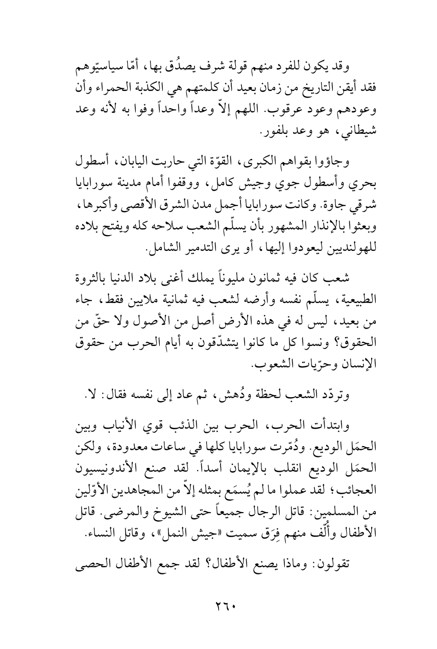 وابتدأت الحرب، الحرب بين الذئب قوي الأنياب وبين الحمَل الوديع. ودُمّرت سورابايا كلها في ساعات معدودة، ولكن الحمَل الوديع انقلب بالإيمان أسداً. لقد صنع الأندونيسيون العجائب؛ لقد عملوا ما لم يُسمَع بمثله إلاّ من المجاهدين الأوّلين من المسلمين: قاتل الرجال جميعاً حتى الشيوخ والمرضى. قاتل الأطفال وأُلّف منهم فِرَق سميت «جيش النمل»، وقاتل النساء.