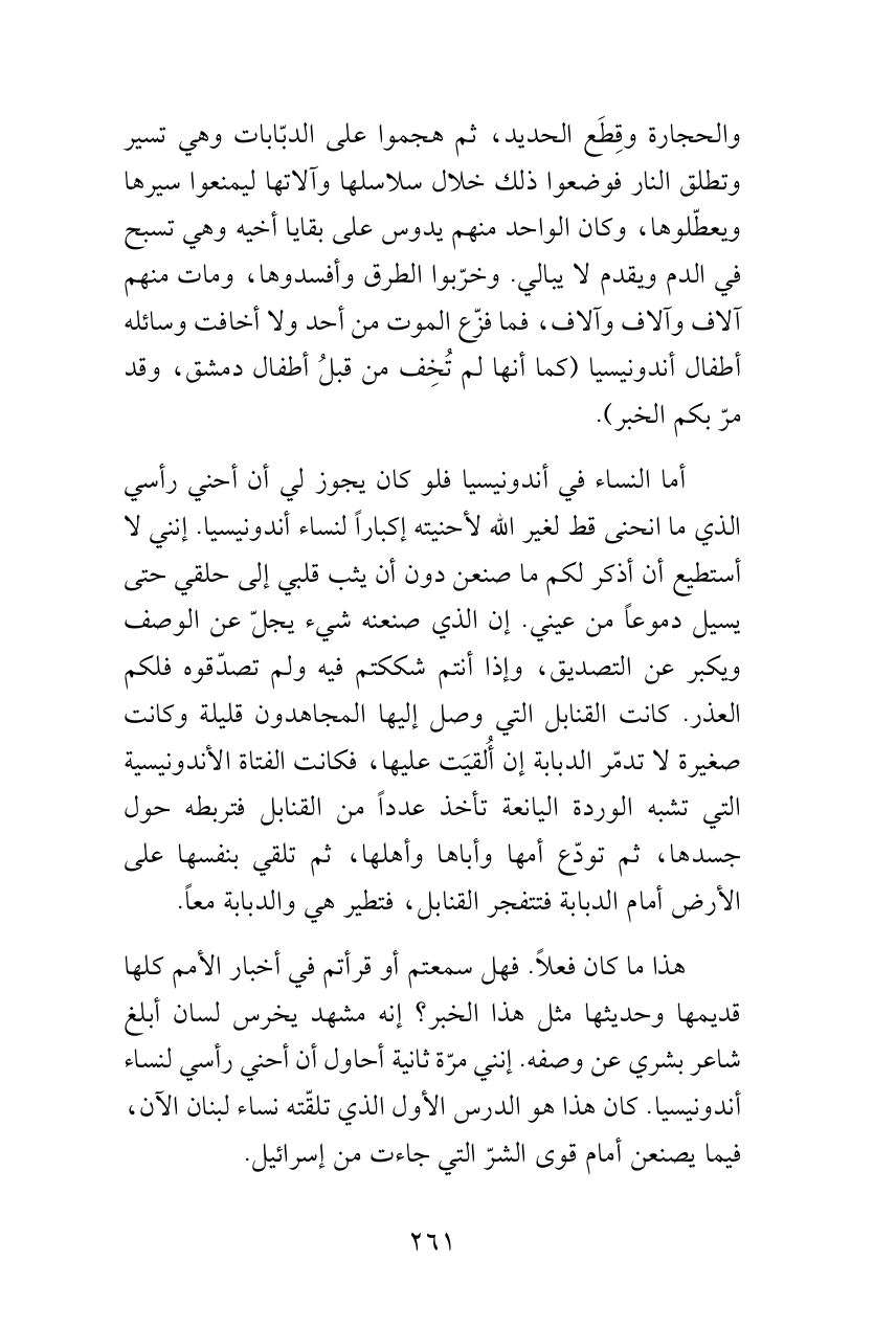 والحجارة وقِطَع الحديد، ثم هجموا على الدبّابات وهي تسير وتطلق النار فوضعوا ذلك خلال سلاسلها وآلاتها ليمنعوا سيرها ويعطّلوها، وكان الواحد منهم يدوس على بقايا أخيه وهي تسبح في الدم ويقدم لا يبالي. وخرّبوا الطرق وأفسدوها، ومات منهم آلاف وآلاف وآلاف، فما فزّع الموت من أحد ولا أخافت وسائله أطفال أندونيسيا (كما أنها لم تُخِف من قبلُ أطفال دمشق، وقد مرّ بكم الخبر).