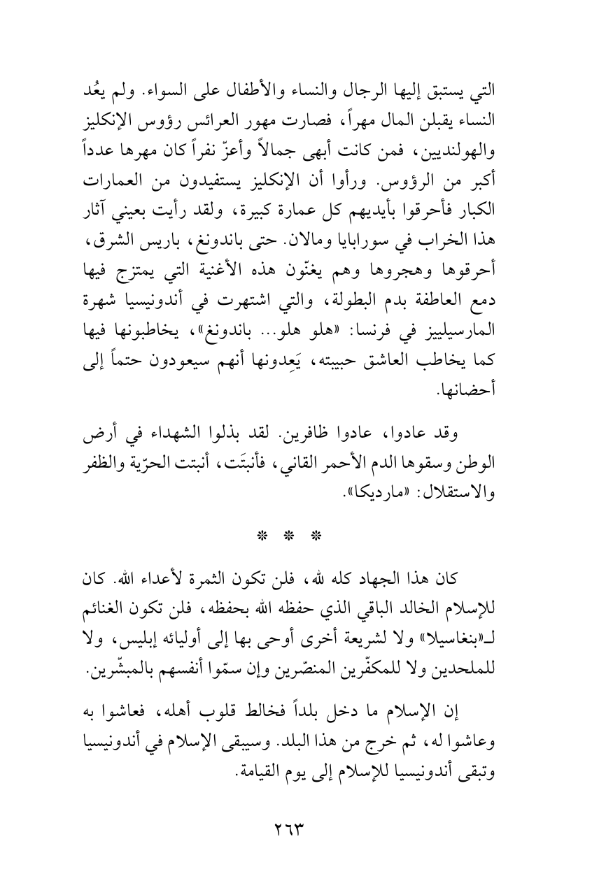 التي يستبق إليها الرجال والنساء والأطفال على السواء. ولم يعُد النساء يقبلن المال مهراً، فصارت مهور العرائس رؤوس الإنكليز والهولنديين، فمن كانت أبهى جمالاً وأعزّ نفراً كان مهرها عدداً أكبر من الرؤوس. ورأوا أن الإنكليز يستفيدون من العمارات الكبار فأحرقوا بأيديهم كل عمارة كبيرة، ولقد رأيت بعيني آثار هذا الخراب في سورابايا ومالان. حتى باندونغ، باريس الشرق، أحرقوها وهجروها وهم يغنّون هذه الأغنية التي يمتزج فيها دمع العاطفة بدم البطولة، والتي اشتهرت في أندونيسيا شهرة المارسيلييز في فرنسا: «هلو هلو ... باندونغ»، يخاطبونها فيها كما يخاطب العاشق حبيبته، يَعِدونها أنهم سيعودون حتماً إلى أحضانها.