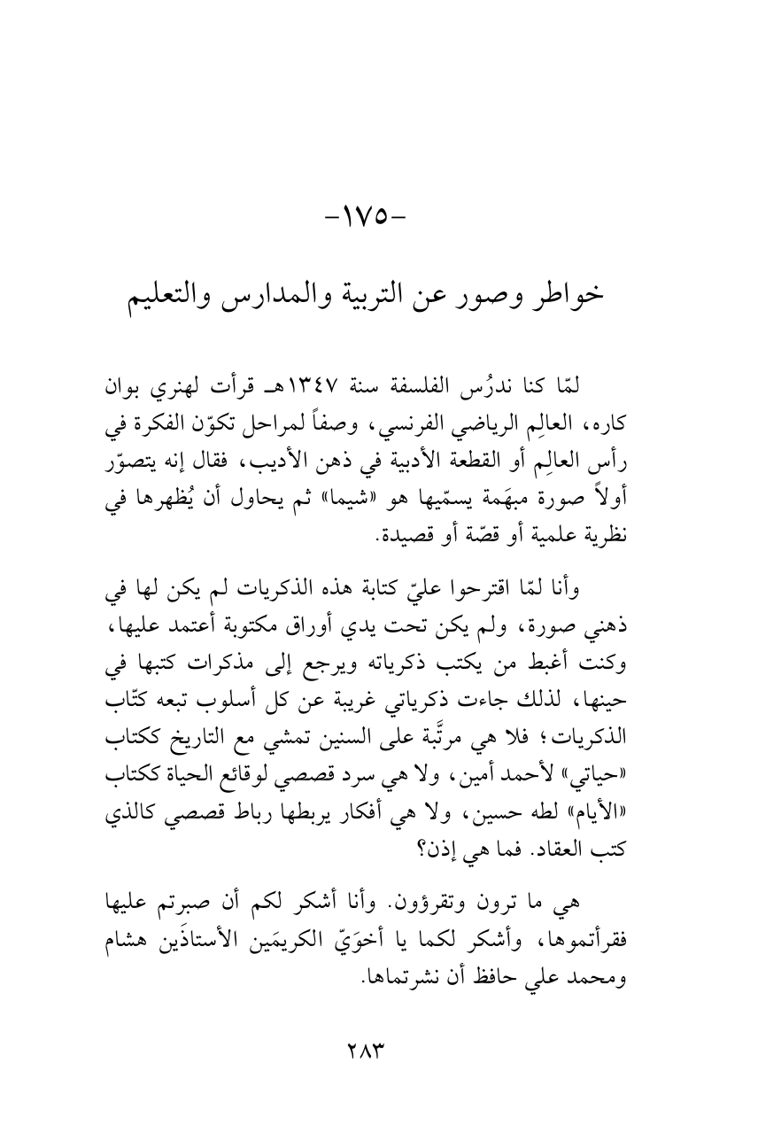 وأنا لمّا اقترحوا عليّ كتابة هذه الذكريات لم يكن لها في ذهني صورة، ولم يكن تحت يدي أوراق مكتوبة أعتمد عليها، وكنت أغبط من يكتب ذكرياته ويرجع إلى مذكرات كتبها في حينها، لذلك جاءت ذكرياتي غريبة عن كل أسلوب تبعه كتّاب الذكريات؛ فلا هي مرتَّبة على السنين تمشي مع التاريخ ككتاب «حياتي» لأحمد أمين، ولا هي سرد قصصي لوقائع الحياة ككتاب «الأيام» لطه حسين، ولا هي أفكار يربطها رباط قصصي كالذي كتب العقاد. فما هي إذن؟
