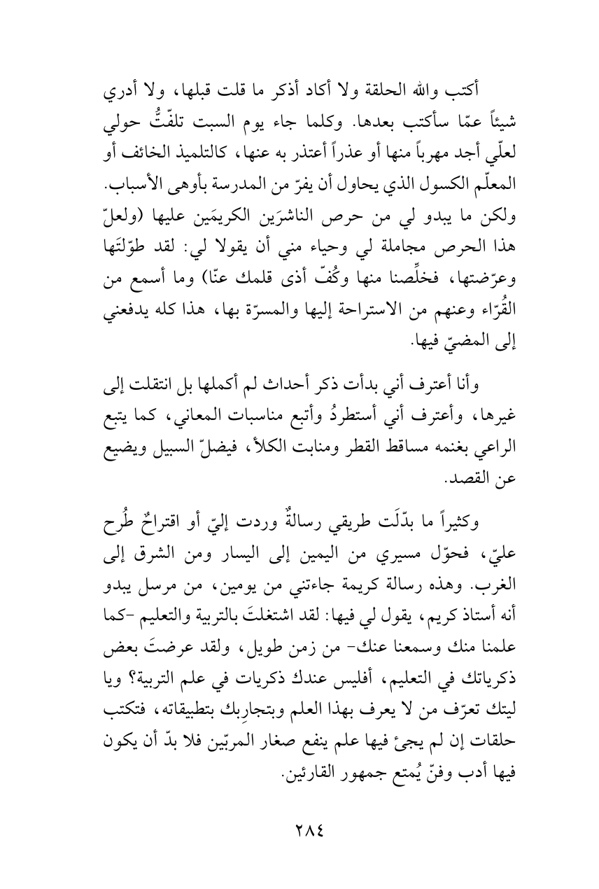أكتب والله الحلقة ولا أكاد أذكر ما قلت قبلها، ولا أدري شيئاً عمّا سأكتب بعدها. وكلما جاء يوم السبت تلفّتُّ حولي لعلّي أجد مهرباً منها أو عذراً أعتذر به عنها، كالتلميذ الخائف أو المعلّم الكسول الذي يحاول أن يفرّ من المدرسة بأوهى الأسباب. ولكن ما يبدو لي من حرص الناشرَين الكريمَين عليها (ولعلّ هذا الحرص مجاملة لي وحياء مني أن يقولا لي: لقد طوّلتَها وعرّضتها، فخلِّصنا منها وكُفّ أذى قلمك عنّا) وما أسمع من القُرّاء وعنهم من الاستراحة إليها والمسرّة بها، هذا كله يدفعني إلى المضيّ فيها.