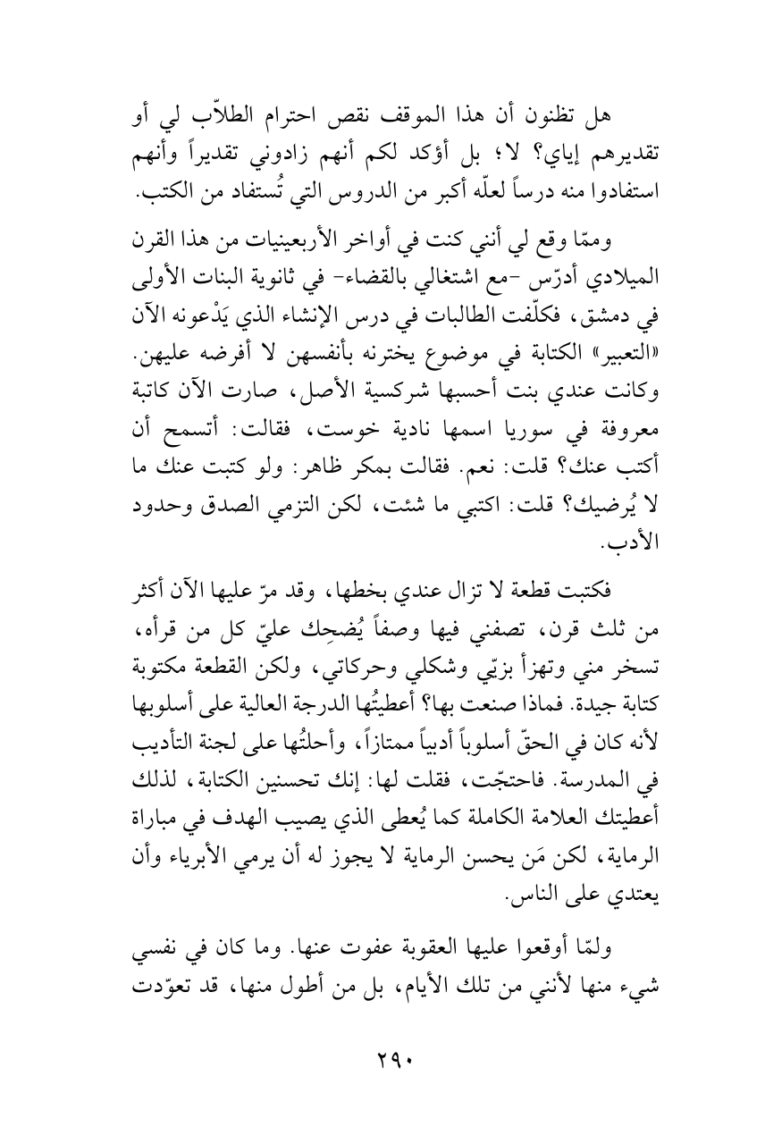 فكتبت قطعة لا تزال عندي بخطها، وقد مرّ عليها الآن أكثر من ثلث قرن، تصفني فيها وصفاً يُضحِك عليّ كل من قرأه، تسخر مني وتهزأ بزيّي وشكلي وحركاتي، ولكن القطعة مكتوبة كتابة جيدة. فماذا صنعت بها؟ أعطيتُها الدرجة العالية على أسلوبها لأنه كان في الحقّ أسلوباً أدبياً ممتازاً، وأحلتُها على لجنة التأديب في المدرسة. فاحتجّت، فقلت لها: إنك تحسنين الكتابة، لذلك أعطيتك العلامة الكاملة كما يُعطى الذي يصيب الهدف في مباراة الرماية، لكن مَن يحسن الرماية لا يجوز له أن يرمي الأبرياء وأن يعتدي على الناس.
