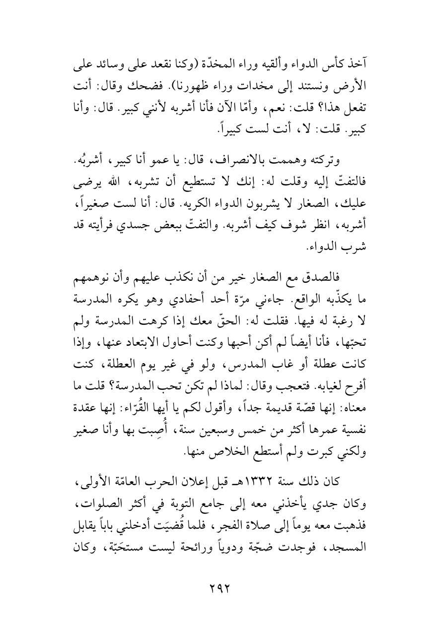 وتركته وهممت بالانصراف، قال: يا عمو أنا كبير، أشربُه. فالتفتّ إليه وقلت له: إنك لا تستطيع أن تشربه، الله يرضى عليك، الصغار لا يشربون الدواء الكريه. قال: أنا لست صغيراً، أشربه، انظر شوف كيف أشربه. والتفتّ ببعض جسدي فرأيته قد شرب الدواء.