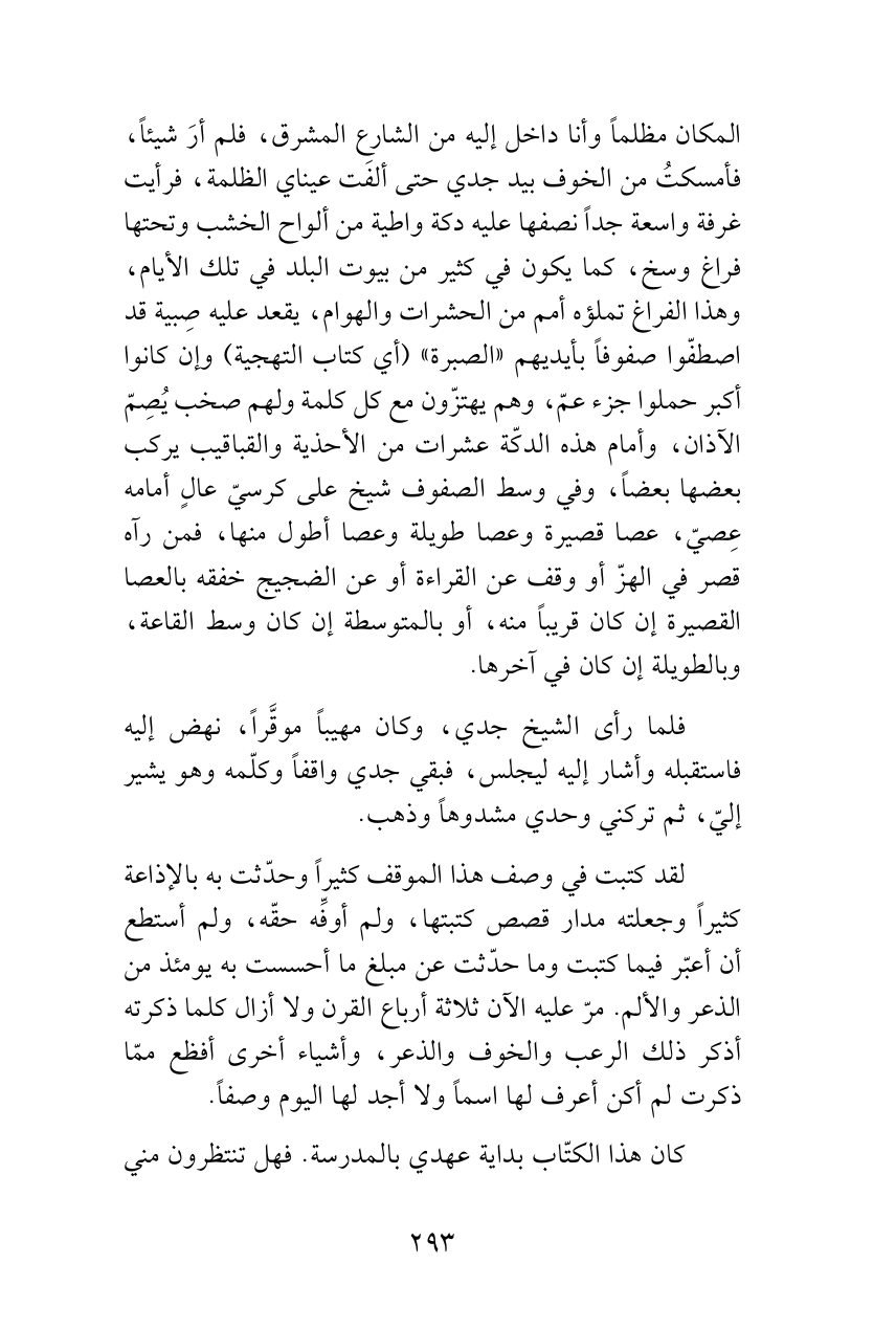 المكان مظلماً وأنا داخل إليه من الشارع المشرق، فلم أرَ شيئاً، فأمسكتُ من الخوف بيد جدي حتى ألفَت عيناي الظلمة، فرأيت غرفة واسعة جداً نصفها عليه دكة واطية من ألواح الخشب وتحتها فراغ وسخ، كما يكون في كثير من بيوت البلد في تلك الأيام، وهذا الفراغ تملؤه أمم من الحشرات والهوام، يقعد عليه صِبية قد اصطفّوا صفوفاً بأيديهم «الصبرة» (أي كتاب التهجية) وإن كانوا أكبر حملوا جزء عمّ، وهم يهتزّون مع كل كلمة ولهم صخب يُصِمّ الآذان، وأمام هذه الدكّة عشرات من الأحذية والقباقيب يركب بعضها بعضاً، وفي وسط الصفوف شيخ على كرسيّ عالٍ أمامه عِصيّ، عصا قصيرة وعصا طويلة وعصا أطول منها، فمن رآه قصر في الهزّ أو وقف عن القراءة أو عن الضجيج خفقه بالعصا القصيرة إن كان قريباً منه، أو بالمتوسطة إن كان وسط القاعة، وبالطويلة إن كان في آخرها.