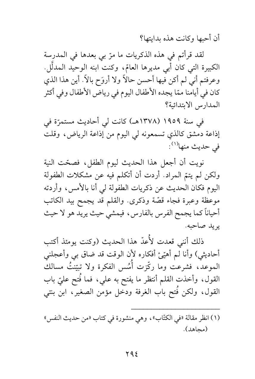 نويت أن أجعل هذا الحديث ليوم الطفل، فصحّت النية ولكن لم يتمّ المراد. أردت أن أتكلم فيه عن مشكلات الطفولة اليوم فكان الحديث عن ذكريات الطفولة لي أنا بالأمس، وأردته موعظة وعبرة فجاء قصّة وذكرى. والقلم قد يجمح بيد الكاتب أحياناً كما يجمح الفرس بالفارس، فيمشي حيث يريد هو لا حيث يريد صاحبه.