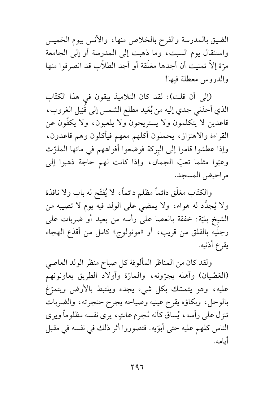 (إلى أن قلت): لقد كان التلاميذ يبقون في هذا الكتّاب الذي أخذني جدي إليه من بُعَيد مطلع الشمس إلى قُبَيل الغروب، قاعدين لا يتكلمون ولا يستريحون ولا يلعبون، ولا يكفّون عن القراءة والاهتزاز، يحملون أكلهم معهم فيأكلون وهم قاعدون، وإذا عطشوا قاموا إلى البِركة فوضعوا أفواههم في مائها الملوّث وعبّوا مثلما تعبّ الجمال، وإذا كانت لهم حاجة ذهبوا إلى مراحيض المسجد.
