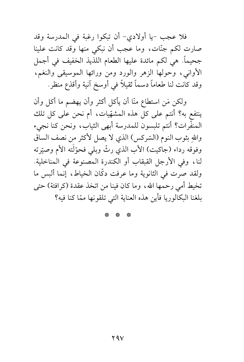 فلا عجب -يا أولادي- أن تبكوا رغبة في المدرسة وقد صارت لكم جنّات، وما عجب أن نبكي منها وقد كانت علينا جحيماً. هي لكم مائدة عليها الطعام اللذيذ الخفيف في أجمل الأواني، وحولها الزهر والورد ومن ورائها الموسيقى والنغم، وقد كانت لنا طعاماً دسماً ثقيلاً في أوسخ آنية وأقذع منظر.