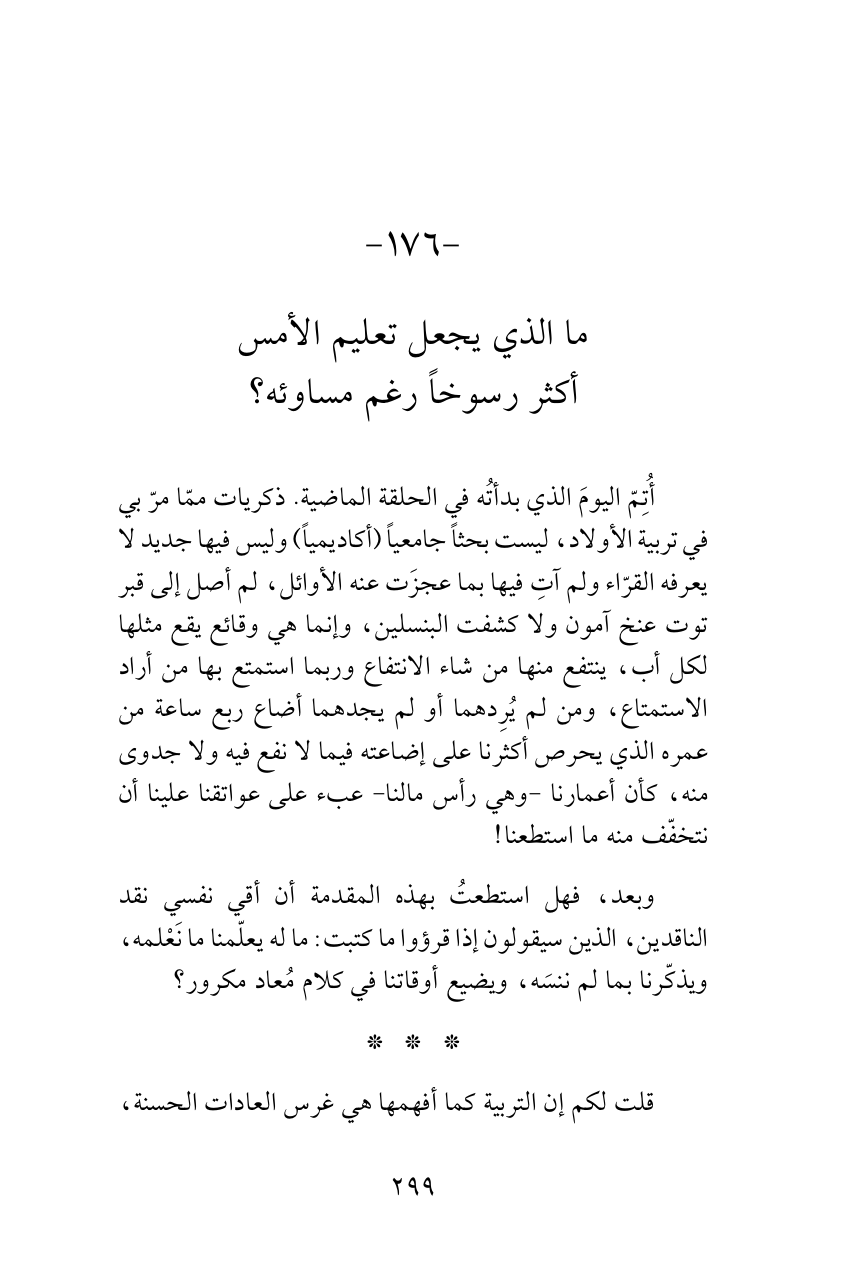 وبعد، فهل استطعتُ بهذه المقدمة أن أقي نفسي نقد الناقدين، الذين سيقولون إذا قرؤوا ما كتبت: ما له يعلّمنا ما نَعْلمه، ويذكّرنا بما لم ننسَه، ويضيع أوقاتنا في كلام مُعاد مكرور؟