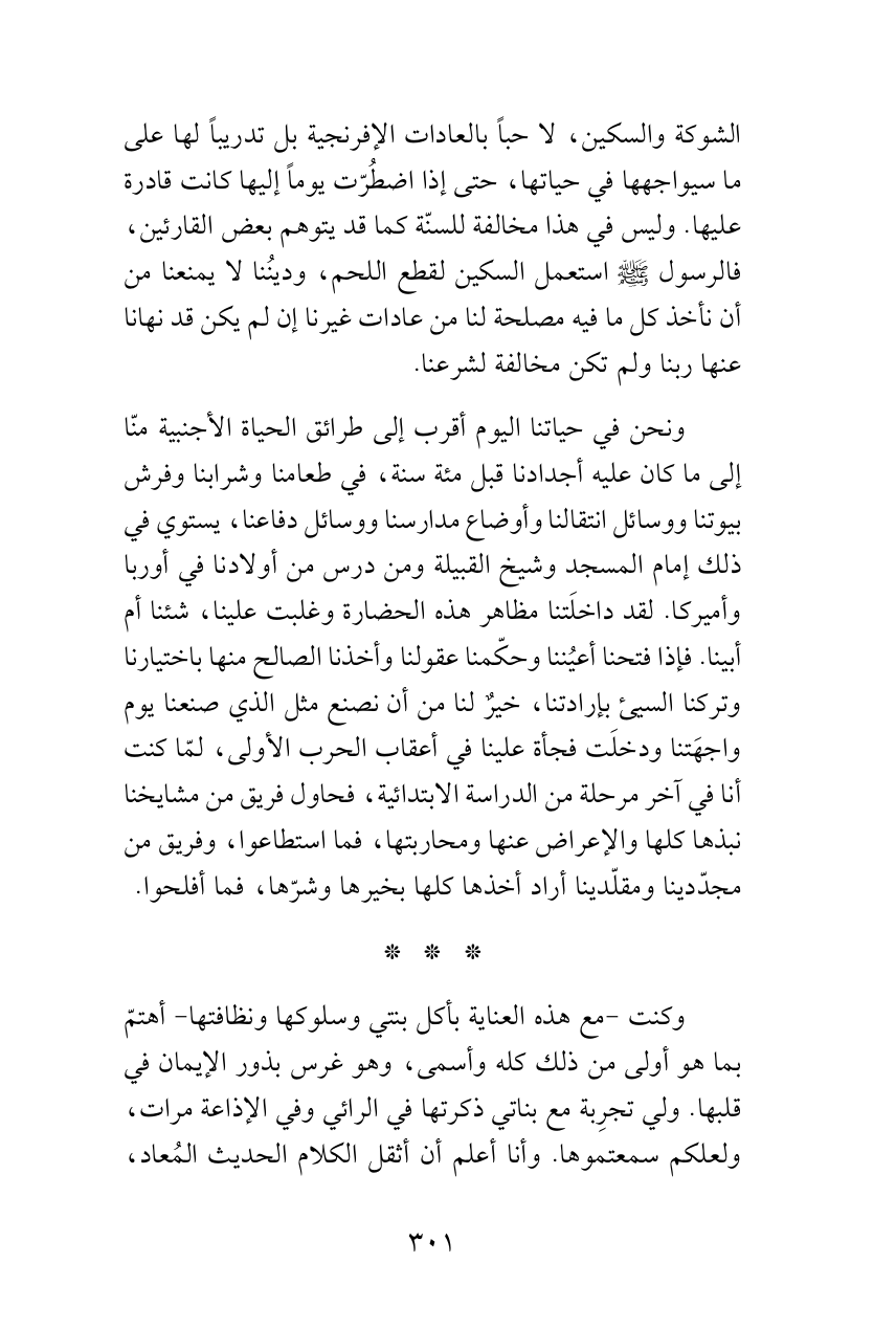 الشوكة والسكين، لا حباً بالعادات الإفرنجية بل تدريباً لها على ما سيواجهها في حياتها، حتى إذا اضطُرّت يوماً إليها كانت قادرة عليها. وليس في هذا مخالفة للسنّة كما قد يتوهم بعض القارئين، فالرسول ‘ استعمل السكين لقطع اللحم، ودينُنا لا يمنعنا من أن نأخذ كل ما فيه مصلحة لنا من عادات غيرنا إن لم يكن قد نهانا عنها ربنا ولم تكن مخالفة لشرعنا.
