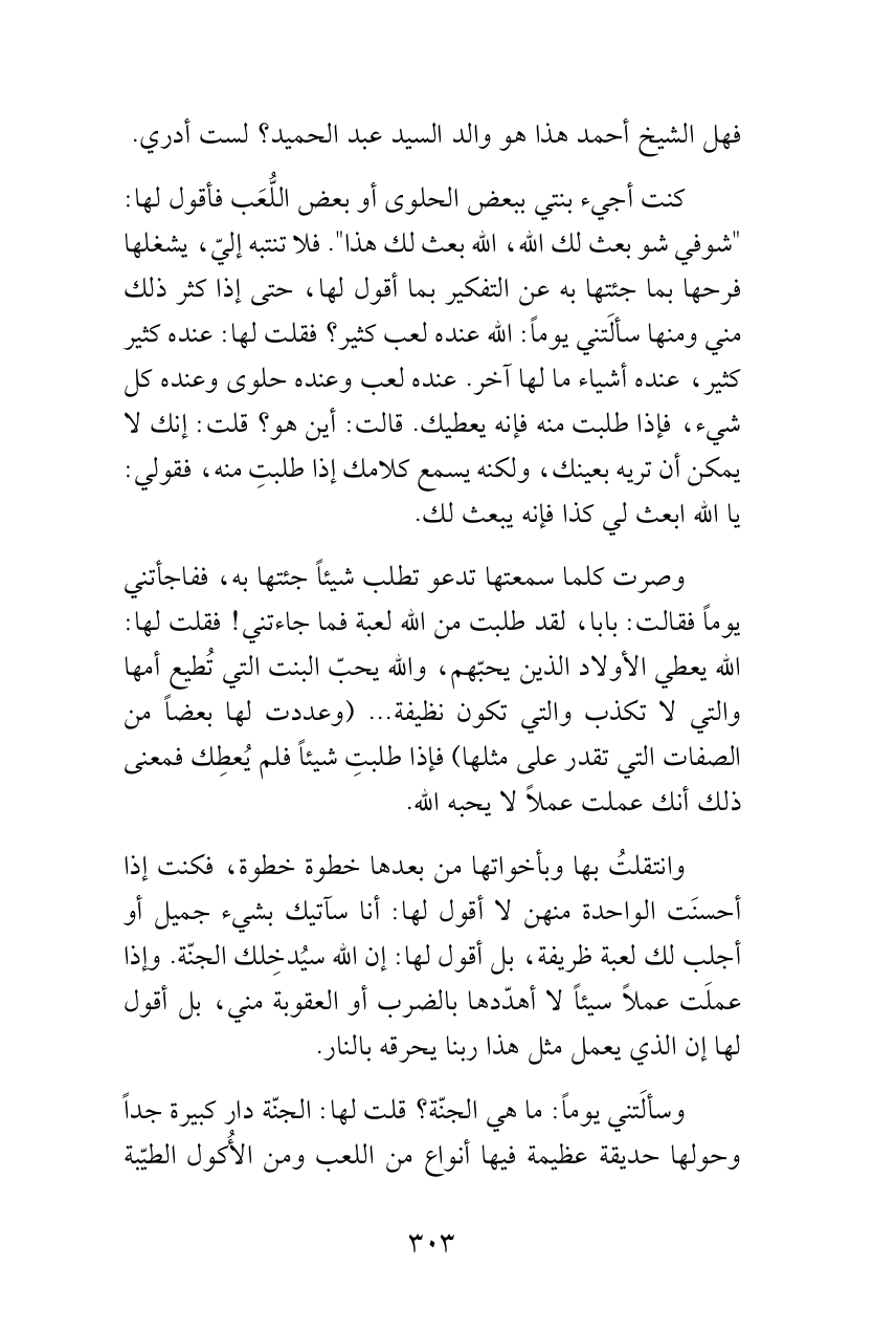 وانتقلتُ بها وبأخواتها من بعدها خطوة خطوة، فكنت إذا أحسنَت الواحدة منهن لا أقول لها: أنا سآتيك بشيء جميل أو أجلب لك لعبة ظريفة، بل أقول لها: إن الله سيُدخِلك الجنّة. وإذا عملَت عملاً سيئاً لا أهدّدها بالضرب أو العقوبة مني، بل أقول لها إن الذي يعمل مثل هذا ربنا يحرقه بالنار.