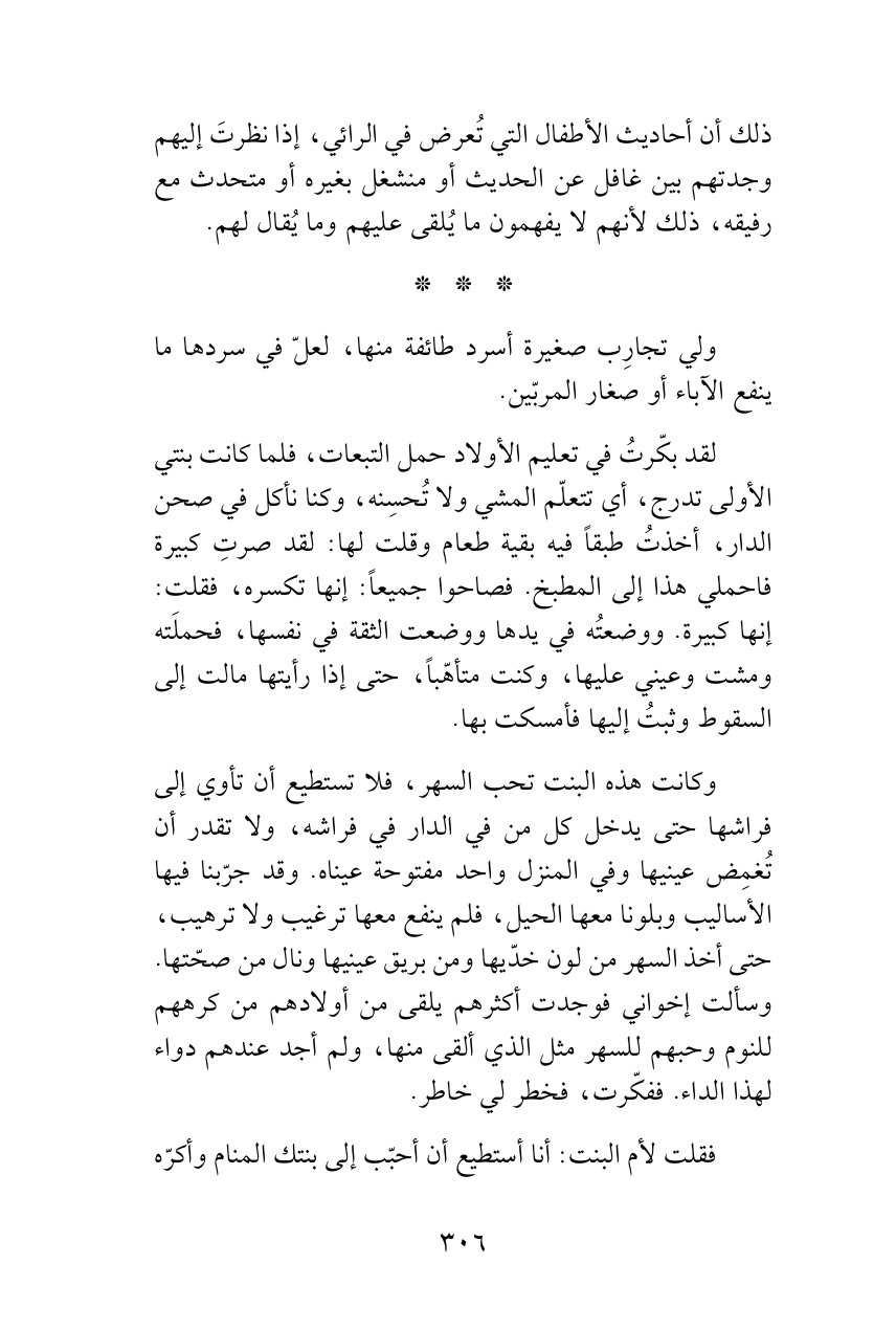 ولي تجارِب صغيرة أسرد طائفة منها، لعلّ في سردها ما ينفع الآباء أو صغار المربّين.