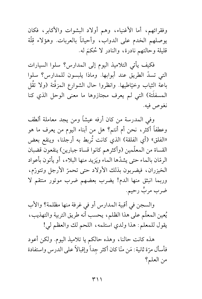 وفي المدرسة من كان أرفه عيشاً ومن يجد معاملة ألطف وعطفاً أكثر، نحن أم أنتم؟ هل من أبناء اليوم من يعرف ما هو «الفلق» (أي الفلقة) الذي كانت تُربط به أرجلنا، وينقع بعض القساة من المعلّمين (وأكثرهم كانوا قساة جبارين) ينقعون قضبان الرمّان بالماء حتى يشدّها الماء ويَزيد منها البلاء، أو يأتون بأعواد الخيزران، فيضربون بذلك الأولاد حتى تحمرّ الأرجل وتتورّم، وربما انبثق منها الدم! يضرب بعضهم ضرب موتور منتقم لا ضرب مربٍّ رحيم.