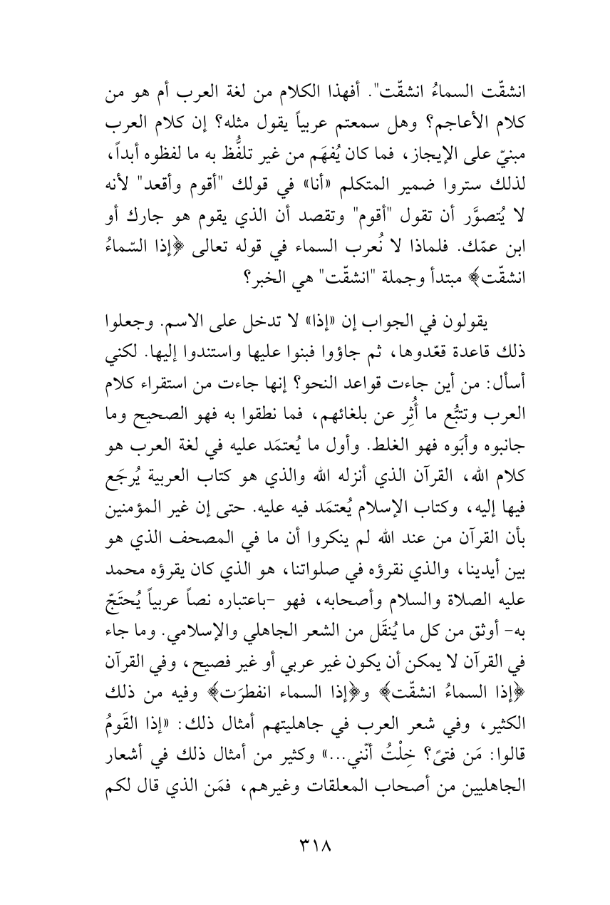 يقولون في الجواب إن «إذا» لا تدخل على الاسم. وجعلوا ذلك قاعدة قعّدوها، ثم جاؤوا فبنوا عليها واستندوا إليها. لكني أسأل: من أين جاءت قواعد النحو؟ إنها جاءت من استقراء كلام العرب وتتبُّع ما أُثِر عن بلغائهم، فما نطقوا به فهو الصحيح وما جانبوه وأبَوه فهو الغلط. وأول ما يُعتمَد عليه في لغة العرب هو كلام الله، القرآن الذي أنزله الله والذي هو كتاب العربية يُرجَع فيها إليه، وكتاب الإسلام يُعتمَد فيه عليه. حتى إن غير المؤمنين بأن القرآن من عند الله لم ينكروا أن ما في المصحف الذي هو بين أيدينا، والذي نقرؤه في صلواتنا، هو الذي كان يقرؤه محمد عليه الصلاة والسلام وأصحابه، فهو -باعتباره نصاً عربياً يُحتَجّ به- أوثق من كل ما يُنقَل من الشعر الجاهلي والإسلامي. وما جاء في القرآن لا يمكن أن يكون غير عربي أو غير فصيح، وفي القرآن {إذا السماءُ انشقّت} و {إذا السماء انفطرَت} وفيه من ذلك الكثير، وفي شعر العرب في جاهليتهم أمثال ذلك: «إذا القَومُ قالوا: مَن فتىً؟ خِلْتُ أنّني ...» وكثير من أمثال ذلك في أشعار الجاهليين من أصحاب المعلقات وغيرهم، فمَن الذي قال لكم