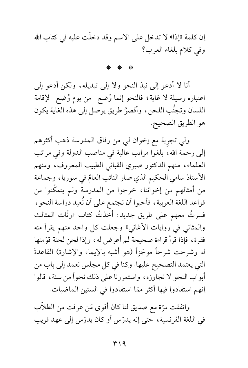 ولي تجرِبة مع إخوان لي من رفاق المدرسة ذهب أكثرهم إلى رحمة الله، بلغوا مراتب عالية في مناصب الدولة وفي مراتب العلماء، منهم الدكتور صبري القباني الطبيب المعروف، ومنهم الأستاذ سامي الحكيم الذي صار النائب العامّ في سوريا، وجماعة من أمثالهم من إخواننا، خرجوا من المدرسة ولم يتمكّنوا من قواعد اللغة العربية، فأحبوا أن نجتمع على أن نُعيد دراسة النحو، فسرتُ معهم على طريق جديد: أخذتُ كتاب «رنّات المثالث والمثاني في روايات الأغاني» وجعلت كل واحد منهم يقرأ منه فقرة، فإذا قرأ قراءة صحيحة لم أعرض له، وإذا لحن لحنة قوّمتها له وشرحت شرحاً موجَزاً (هو أشبه بالإيماء والإشارة) القاعدةَ التي يعتمد التصحيح عليها. وكنا في كل مجلس نعمد إلى باب من أبواب النحو لا نجاوزه، واستمررنا على ذلك نحواً من سنة، قالوا إنهم استفادوا فيها أكثر ممّا استفادوا في السنين الماضيات.